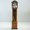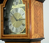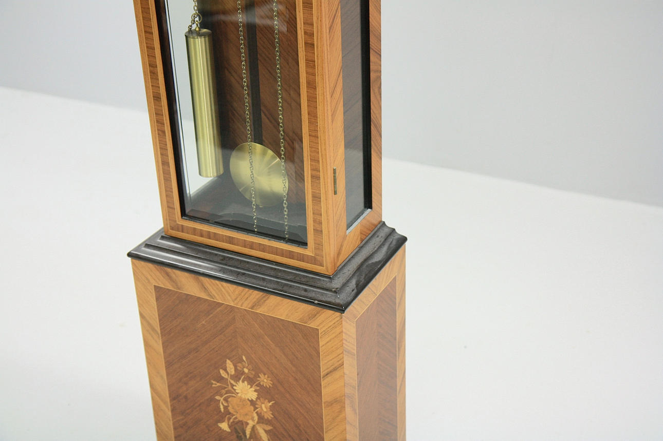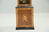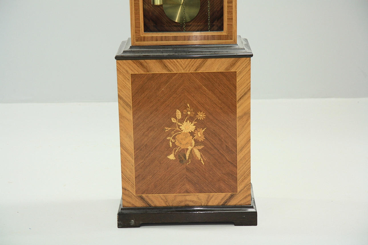 Etui mit Intarsien. Messingfarbenes Zifferblatt mit schwarzem Gravurdekor. Beschläge aus Metall.