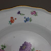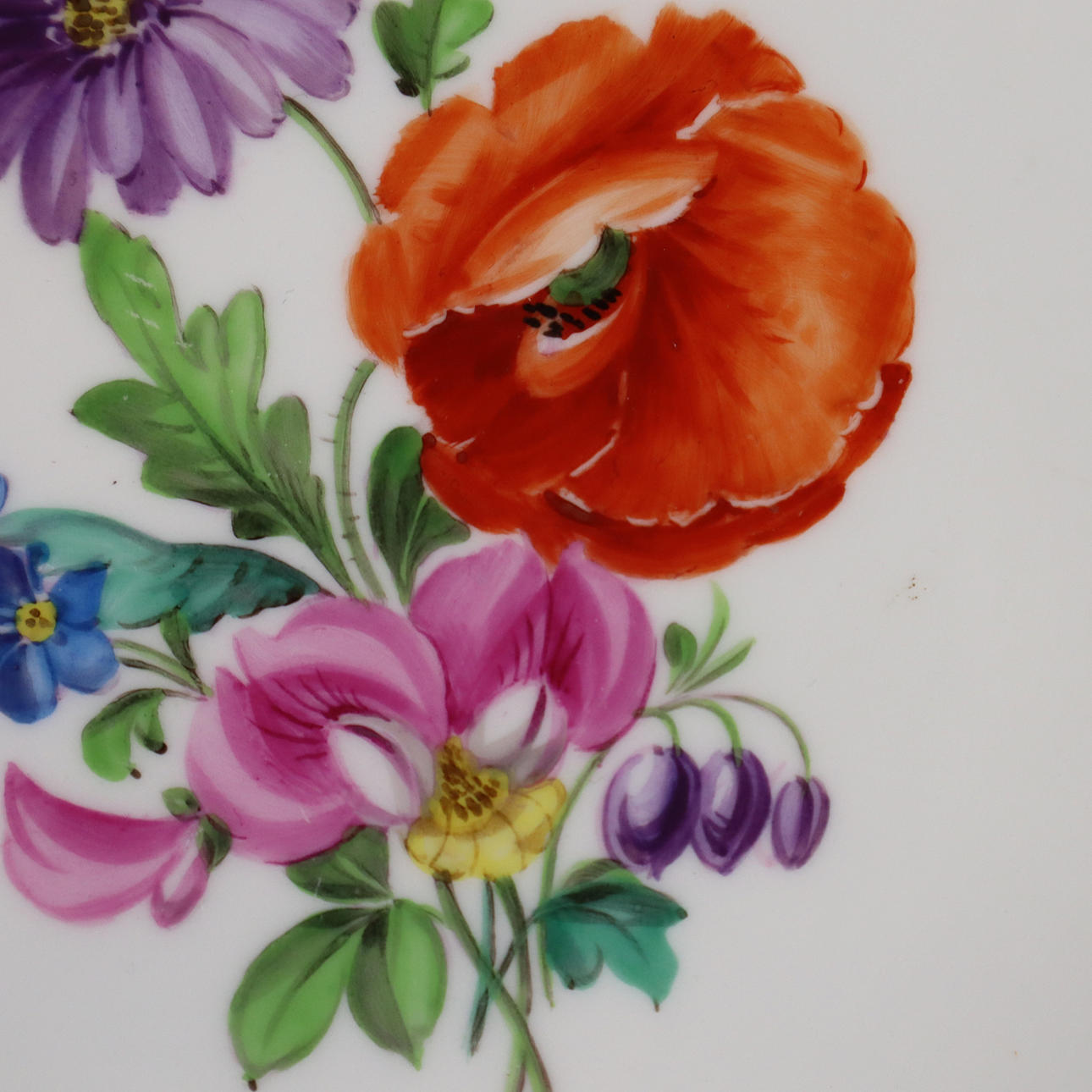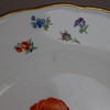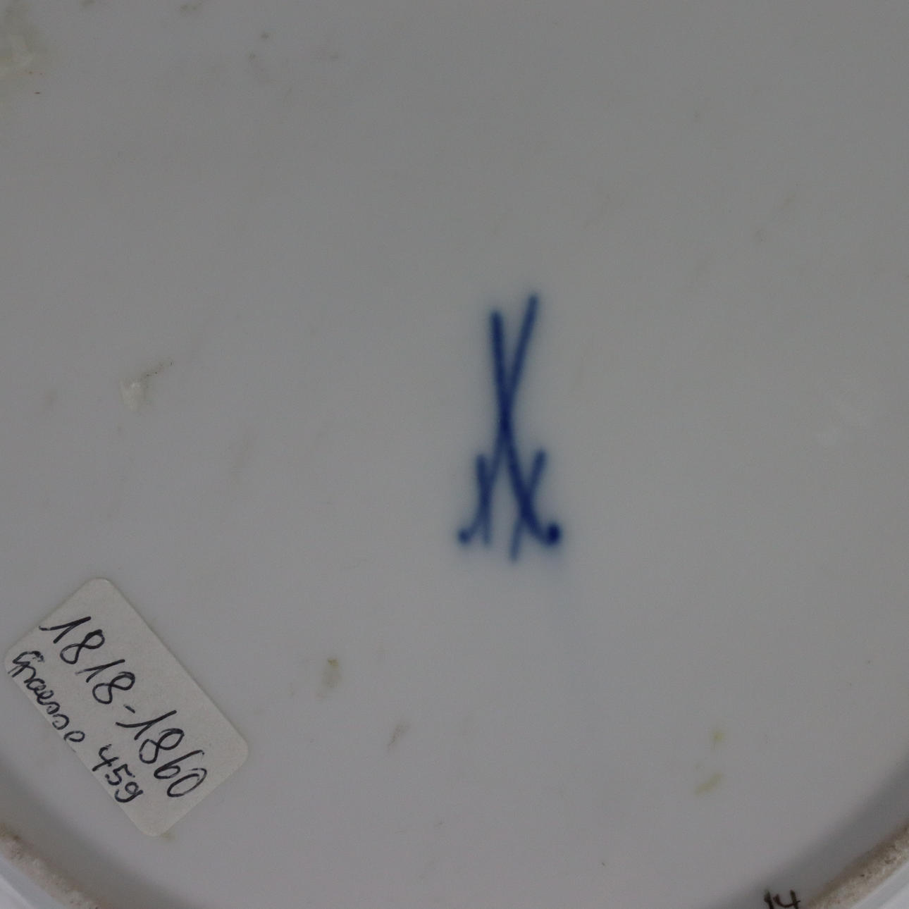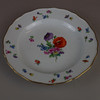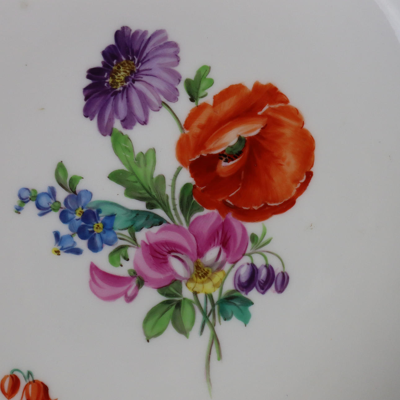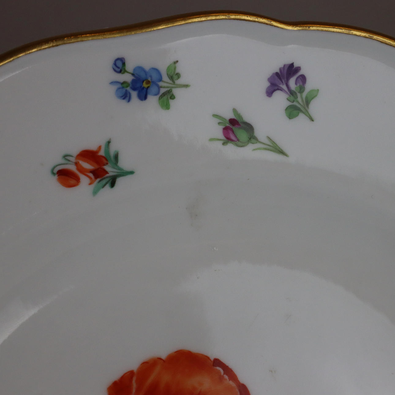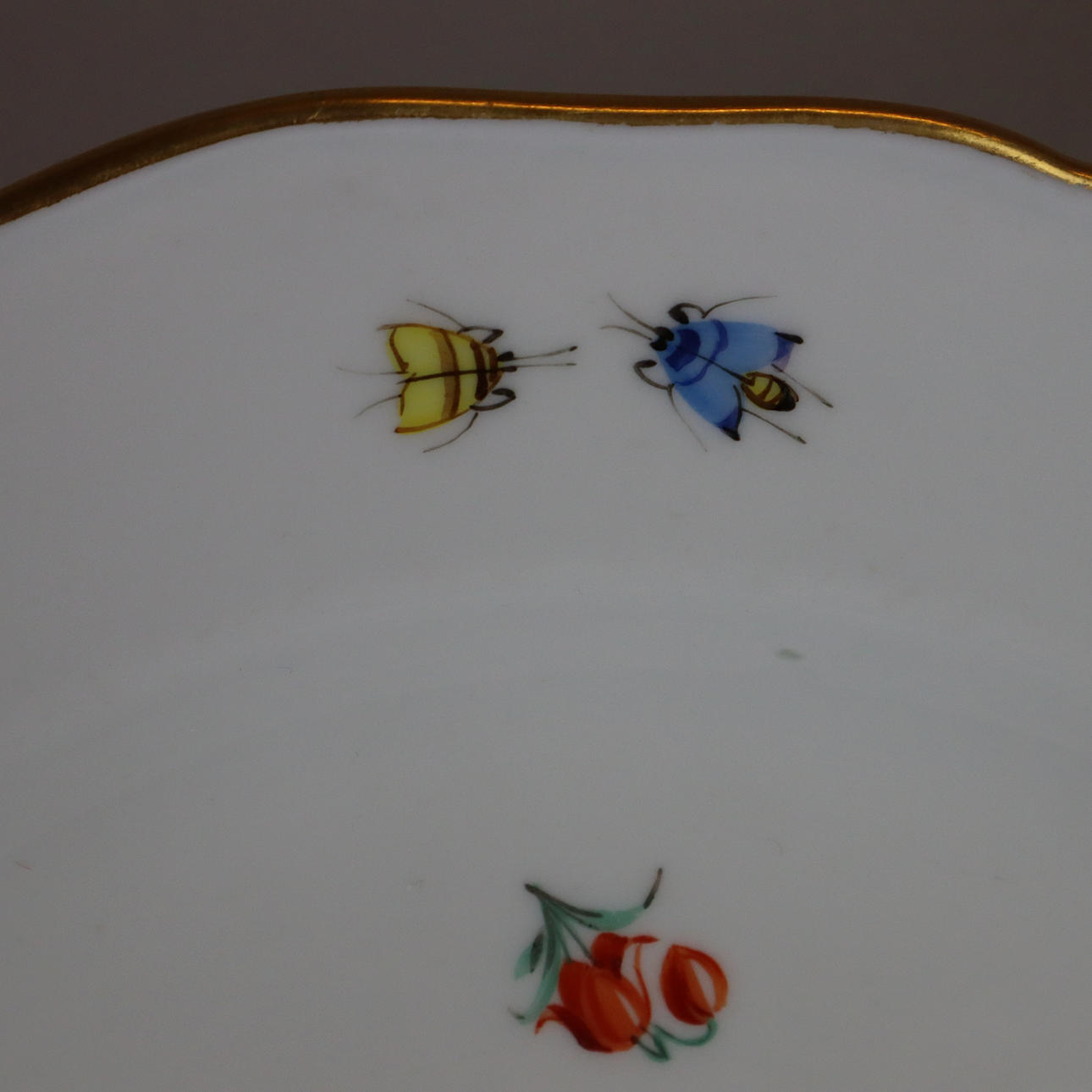 Teller - Meissen Schwertermarke, 19.Jh., flach gemuldet, in polychromer Malerei zentrales Blumenbouquet, Streublümchen und Insekten, goldgerandet, unterseitig unterglasurblaue Schwertermarke sowie Pressnr. "5", Dm.ca.24cm.