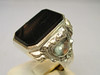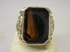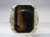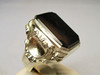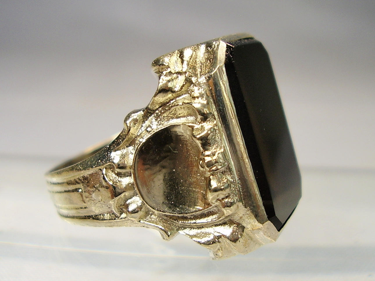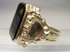 Er hat einen großen Ring-Kopf und ist besetzt mit einer dunklen, teils etwas transparenten Achat-Platte in oktogonaler Form, die von einer glatten Zarge gehalten wird. Durch die Göße des Tafelsteins ist dieser auch ideal geeignet für Monogramm- oder Wappengravuren.