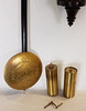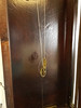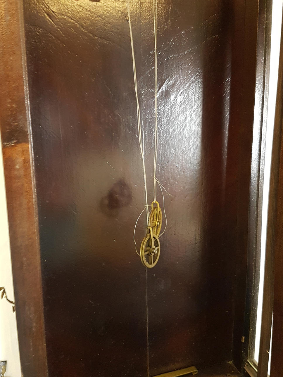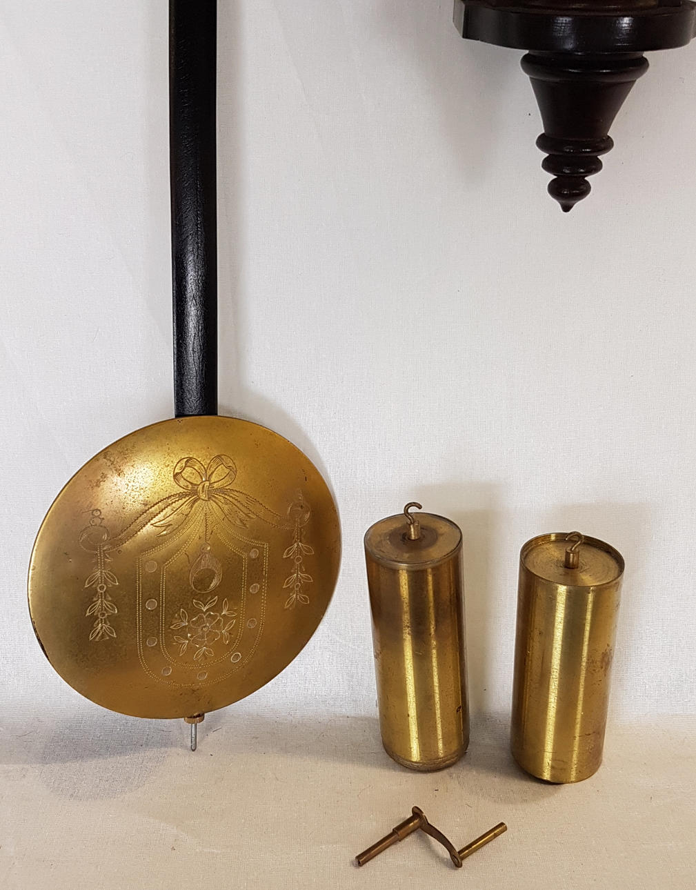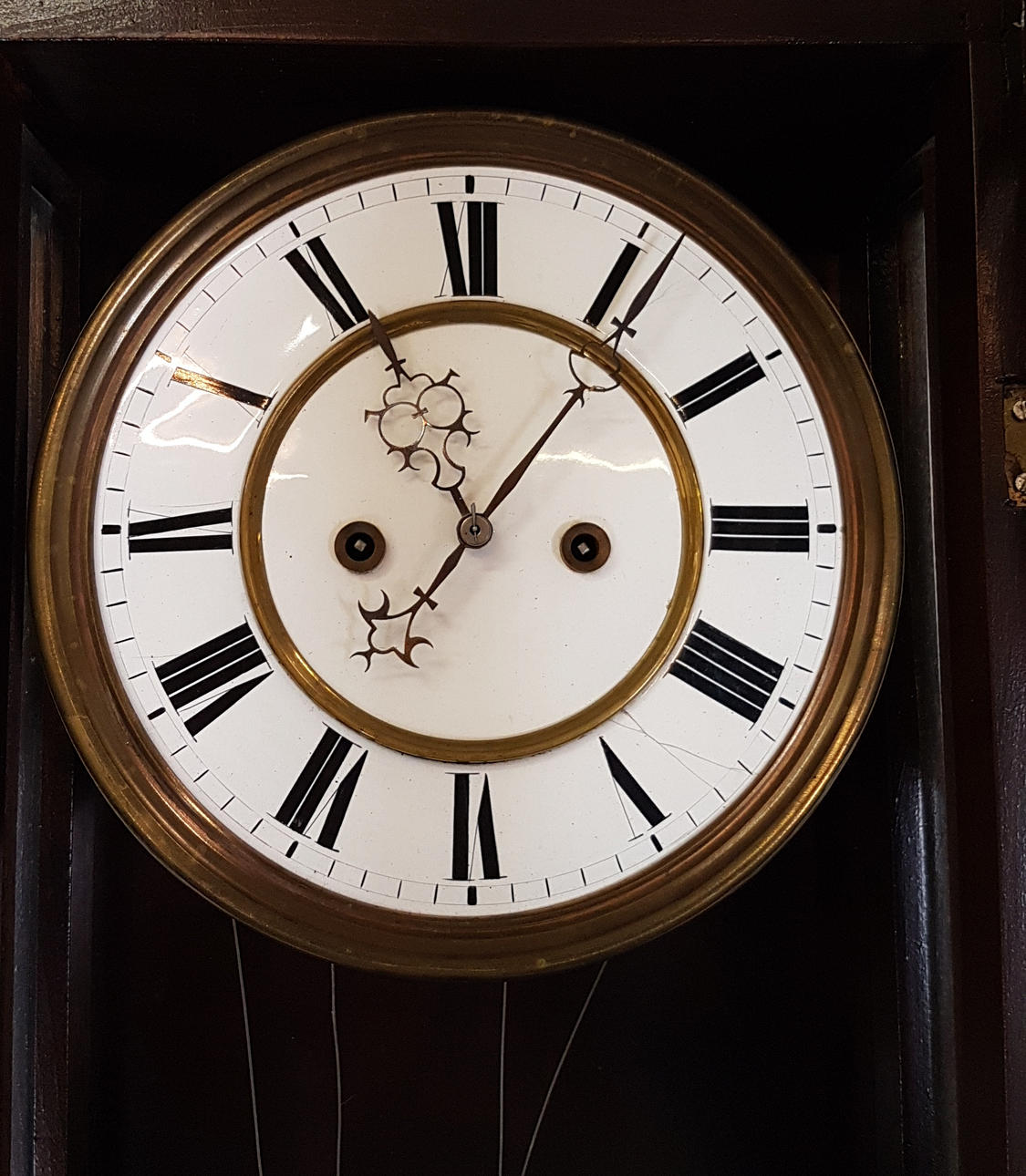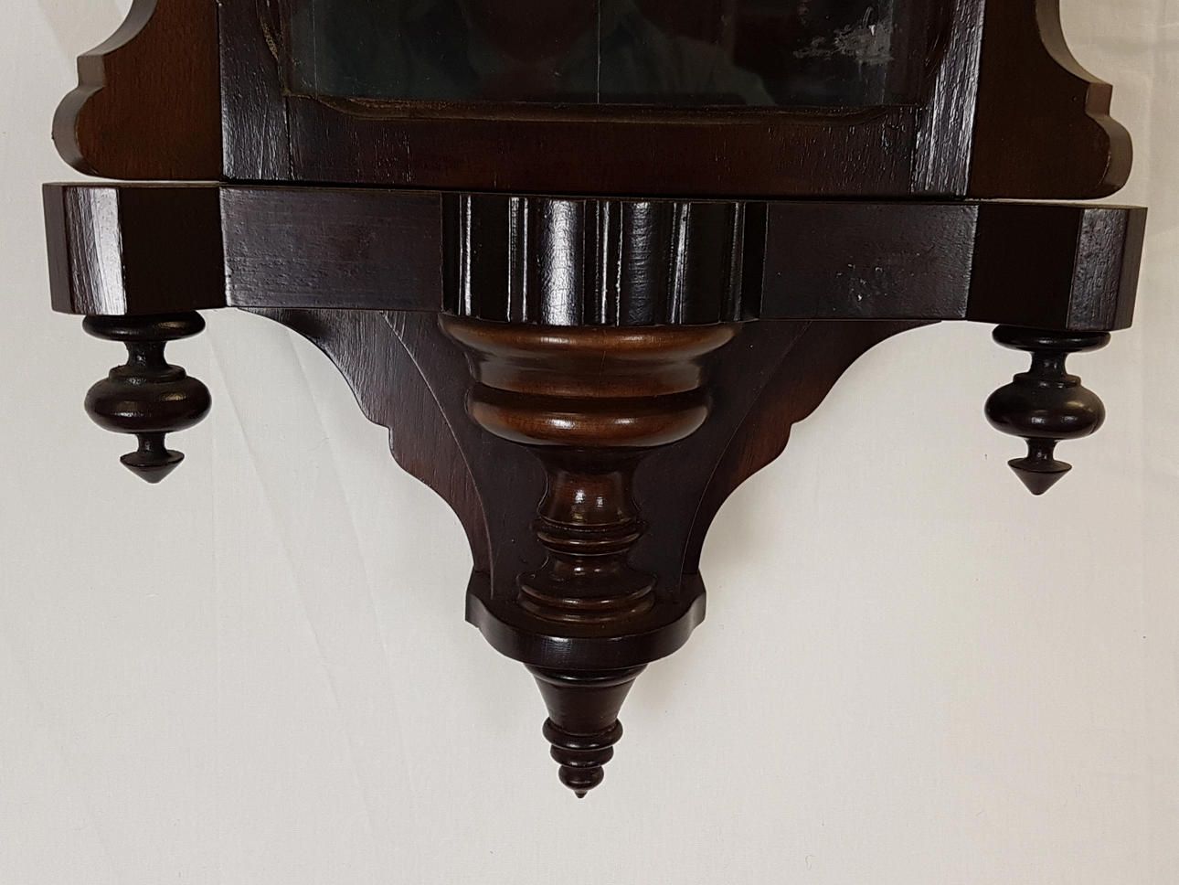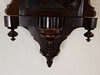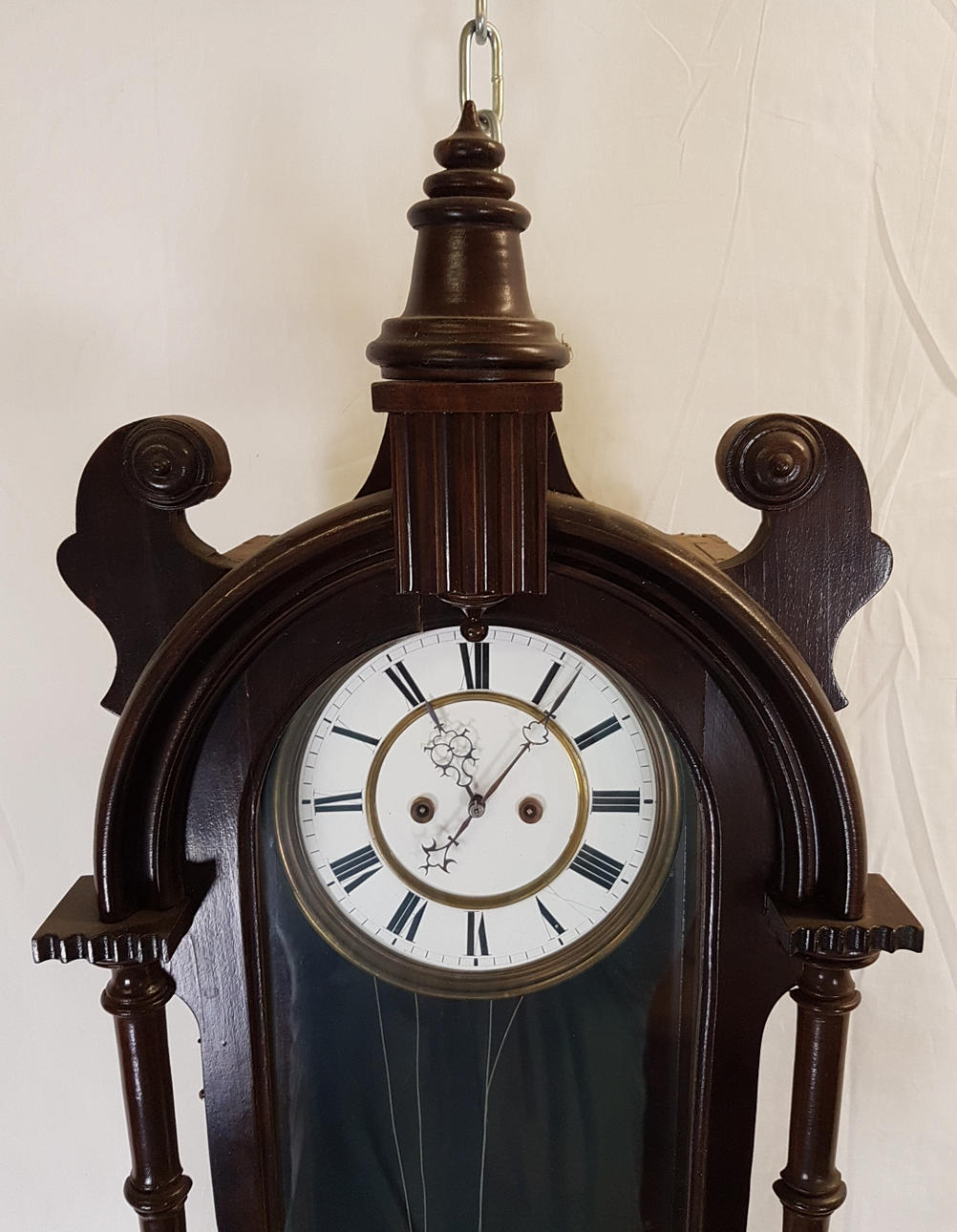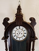 verglastes Nussbaumgehäuse, beschnitzt, Emaillezifferblatt mit röm. Zahlen und kunstvoll ausgesägten Zeigern, Schlag auf Tonfeder 1/2+ 1/1, 2 Gewichte, Funktion nicht geprüft, ca. 115 x 32 x 15 cm.
