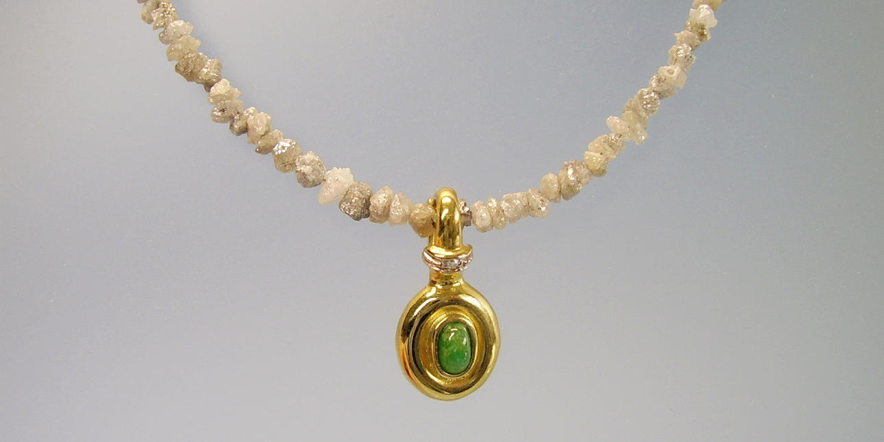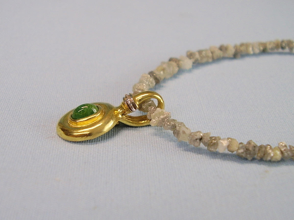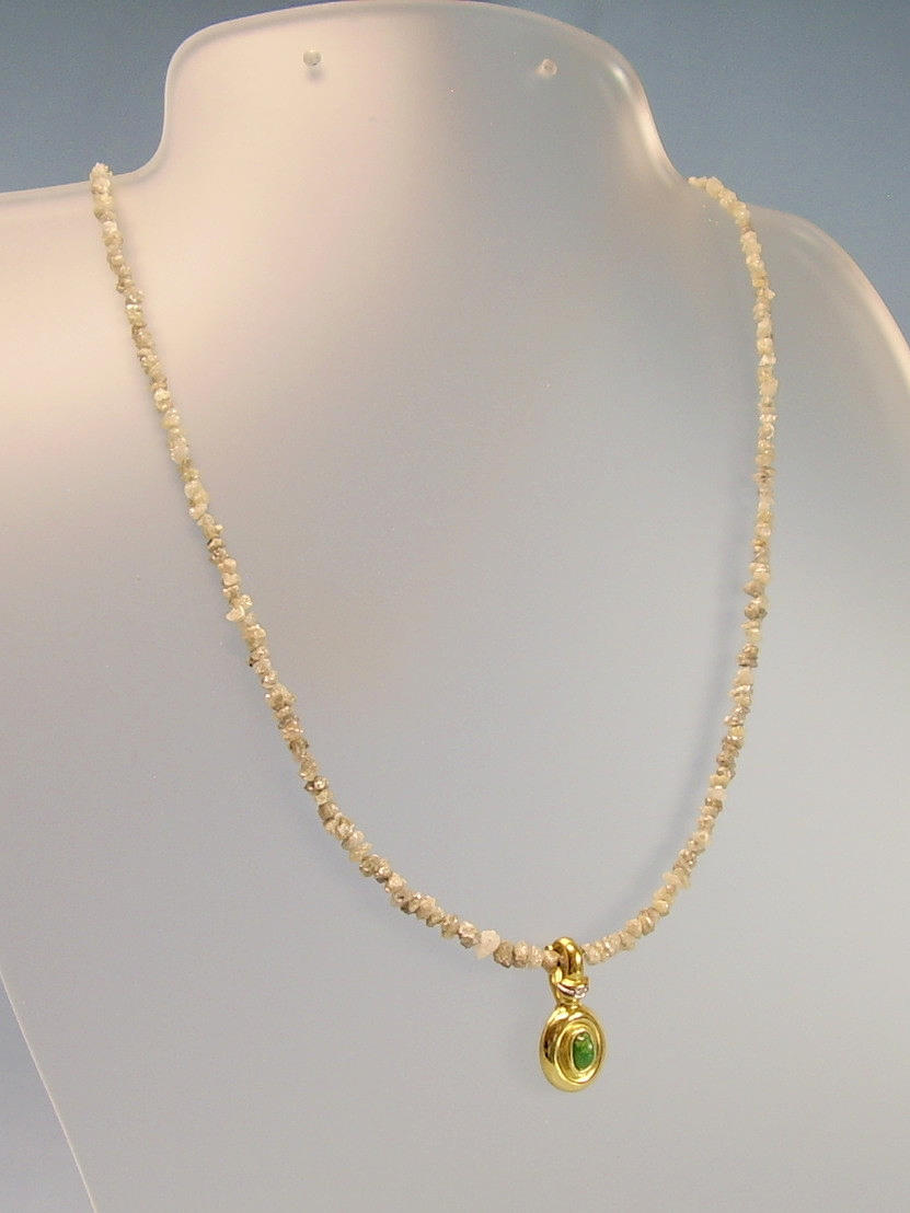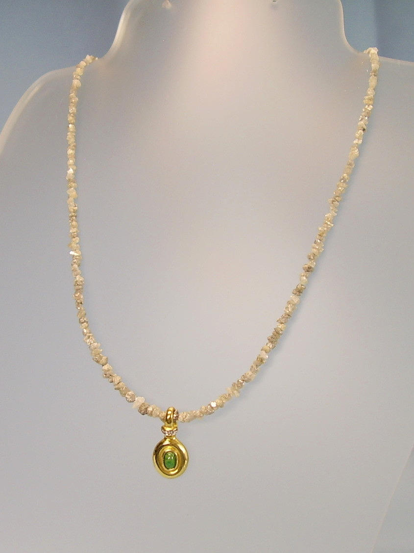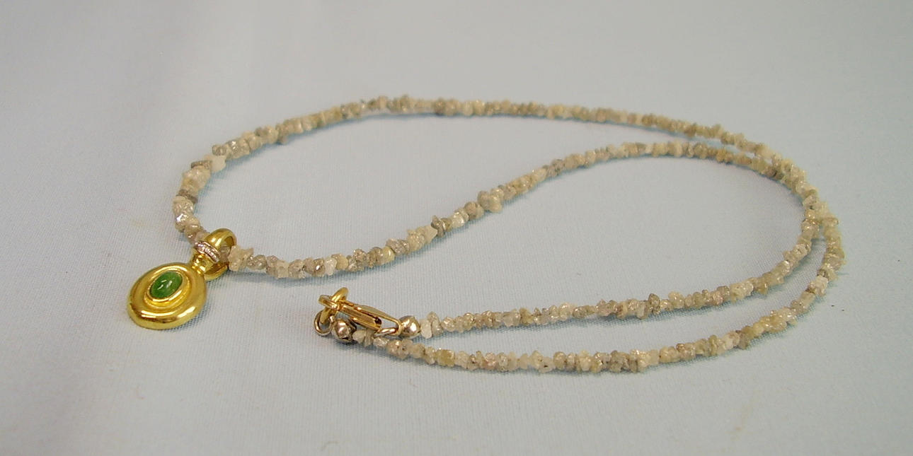 Die Rohdiamant-Kette ist aus champagnerfarbenen hellen Diamanten im leichten Verlauf gearbeitet und wird durch eine 14-karätige Goldschließe (punziert GG 585) geöffnet.
