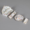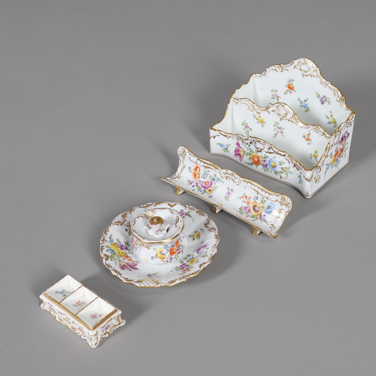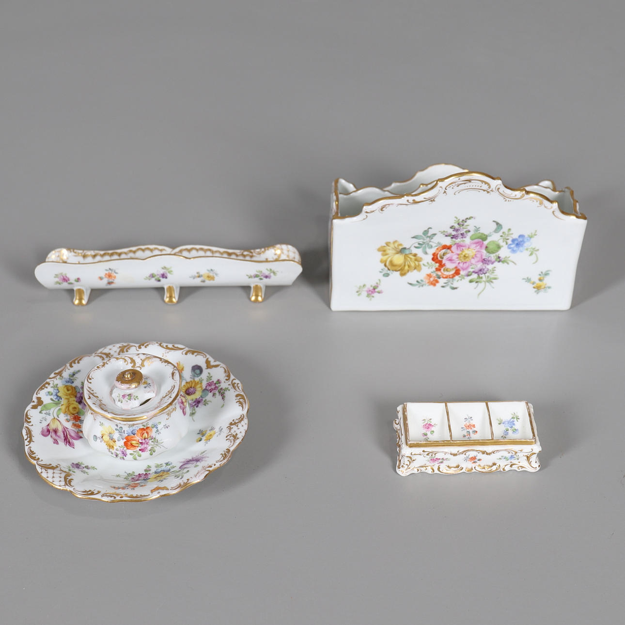 Georg(e) Heufel & Co, um 1890-1900, jeweils im Meissener Stil bemalt mit Deutschen Blumen und Einzelblumen, alle mit vergoldeten Rollbordüren bestehend; ein Schreibwarenhalter mit zwei Unterteilungen, 13 cm hoch, 17 cm breit, 10 cm tief, eine Stiftmulde, 18 cm lang, ein ungewöhnlicher Stempelhalter mit drei Unterteilungen, 9 cm lang, und ein rundes Tintenfass, Deckel und Ständer, 14 cm Durchmesser, alle mit eingeprägten oder gemalten Markierungen (4) .