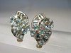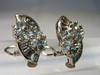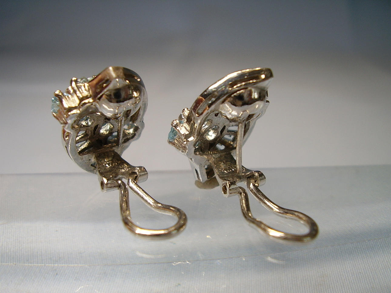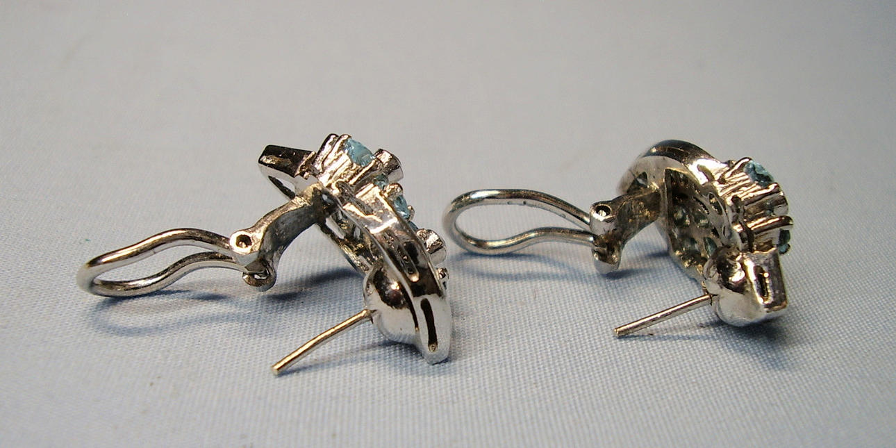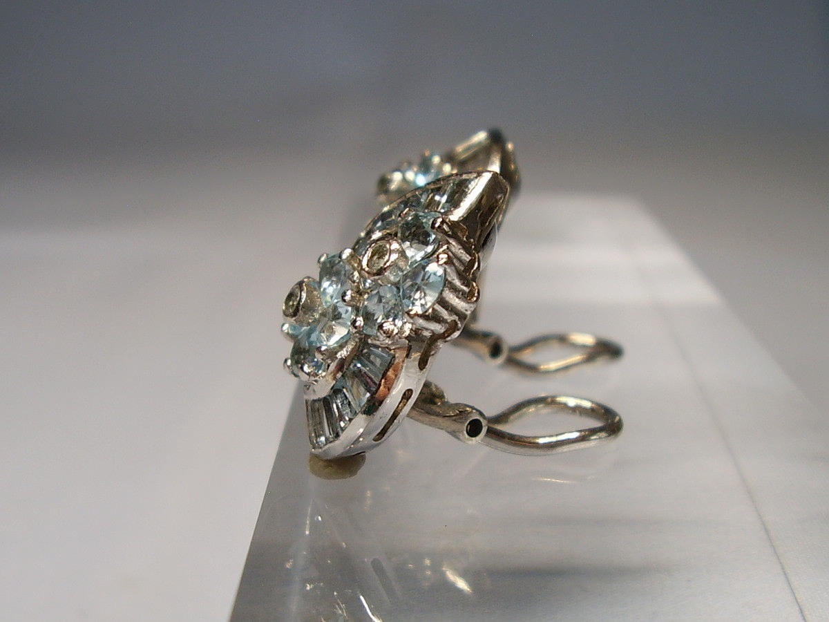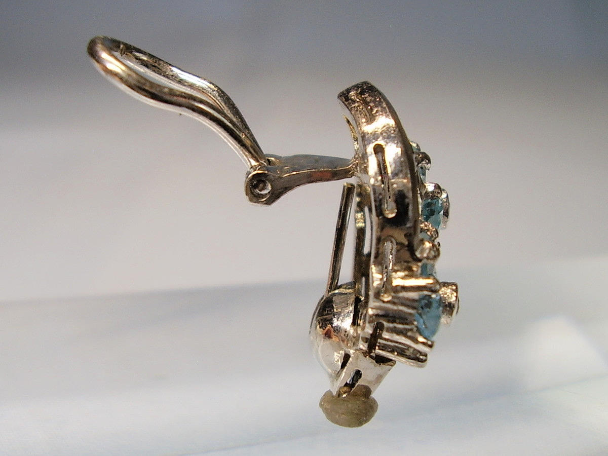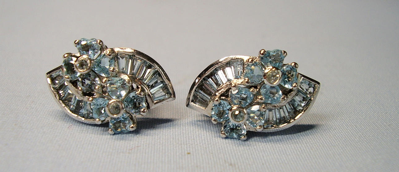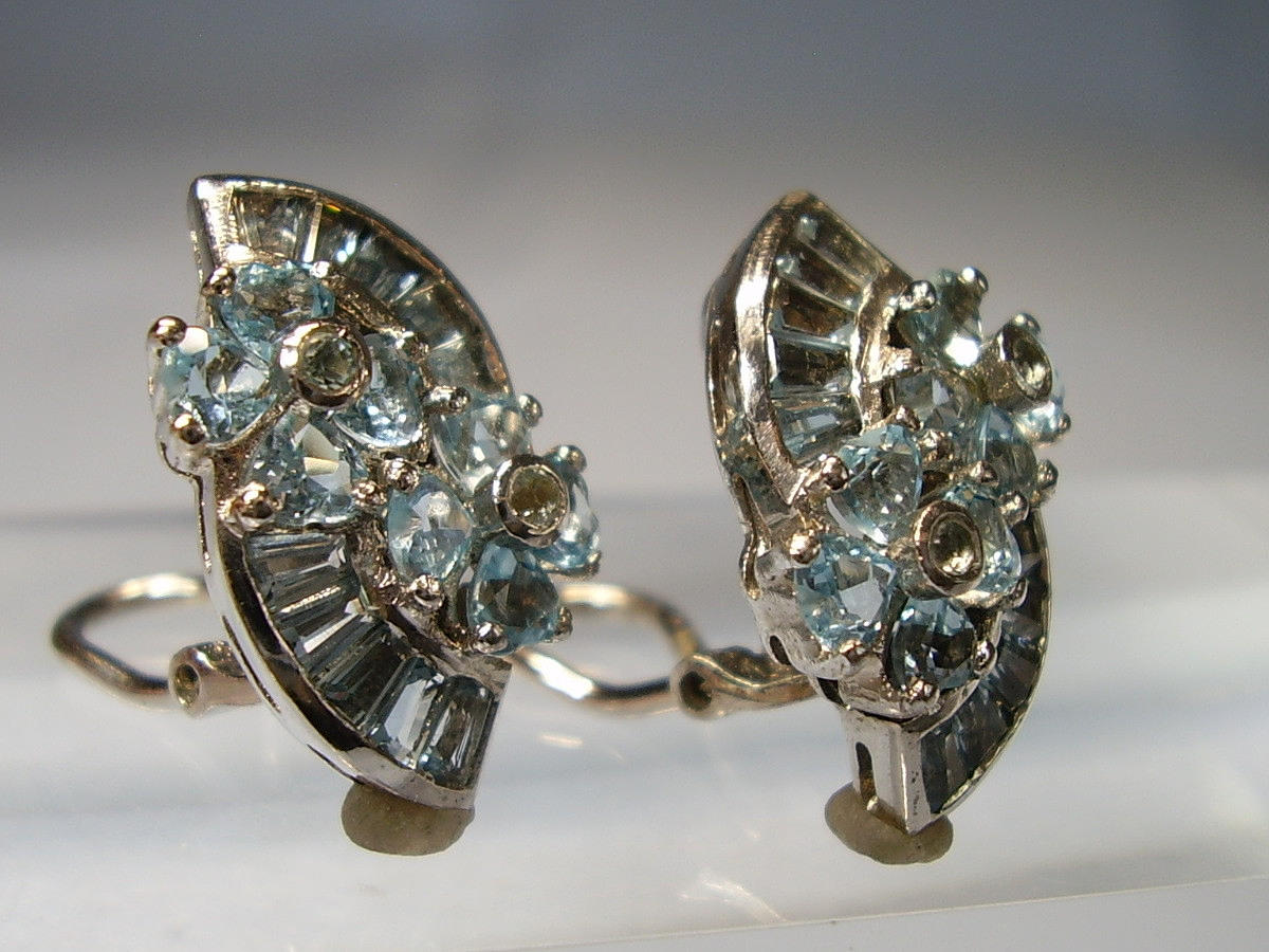 Ohrringe in technisch aufwendiger Ausführung. Die Schauseiten sind besetzt mit himmelblauen facettierten Topasen im Herz- und Baquette-Schliff. Die Topase sind zu stilisierten Blüten angeordnet.