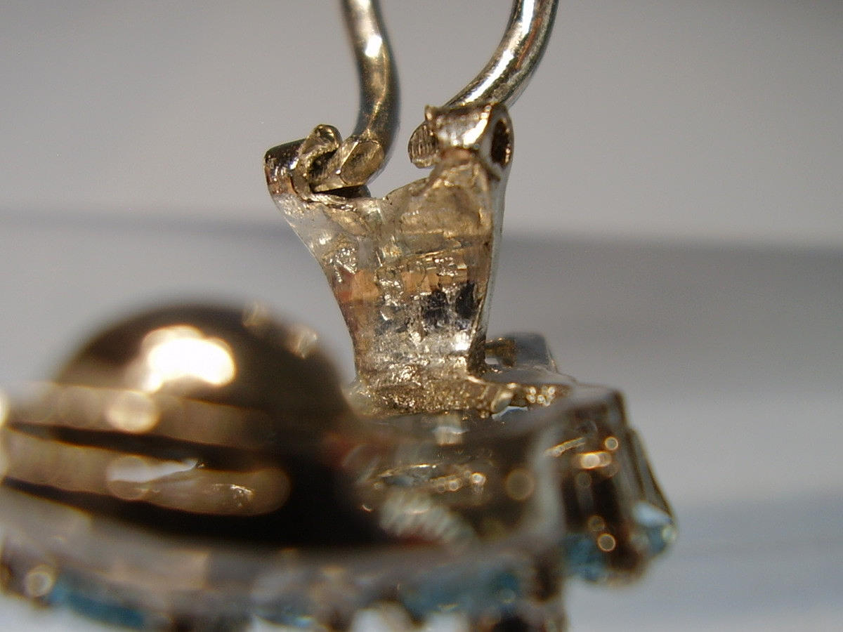 Die Ohrringe sind in Silber 925 gearbeitet und auch so auf den Clip-Brisuren innen punziert. Dieser Designer-Entwurf ist sowohl als Ohrclips als auch Ohrstecker mit Klapp-Vorrichtung zum Aufrichten mit Omega-Bügel zu tragen.