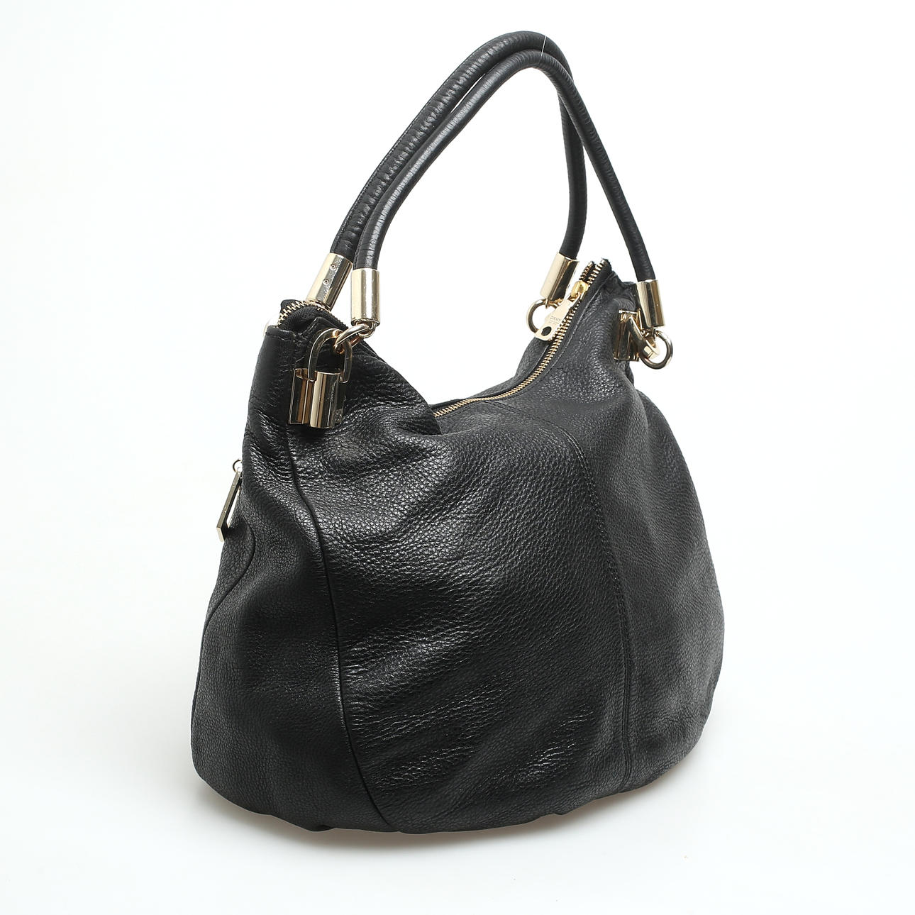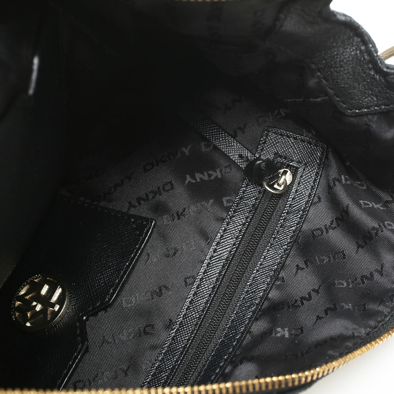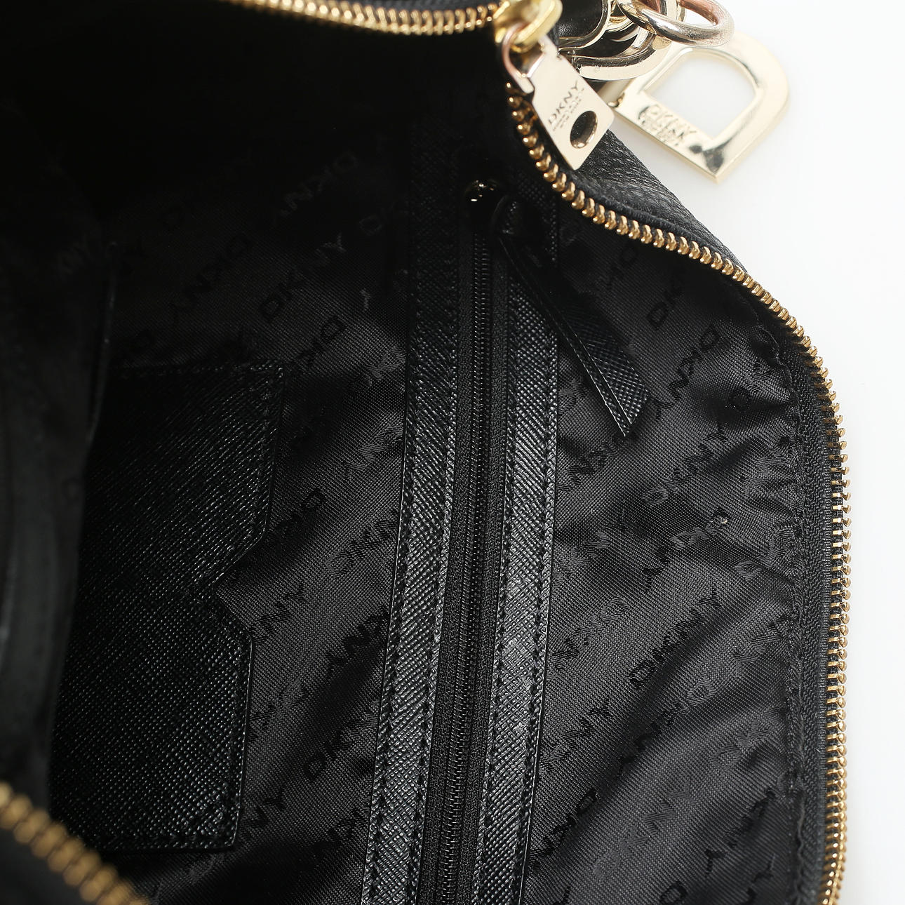 Schwarz. Vier Innenfächer, davon zwei mit Reißverschlüssen.