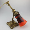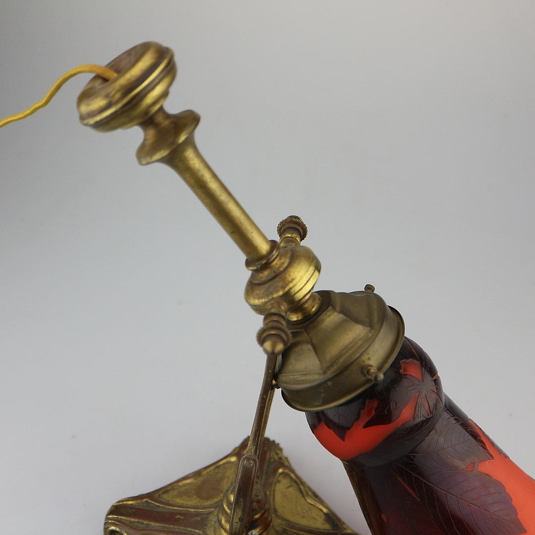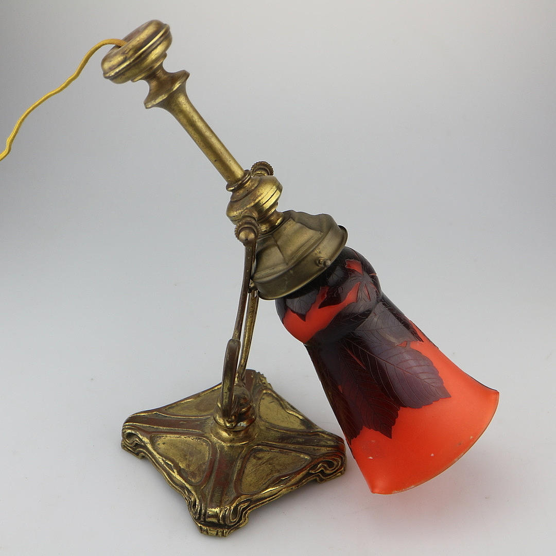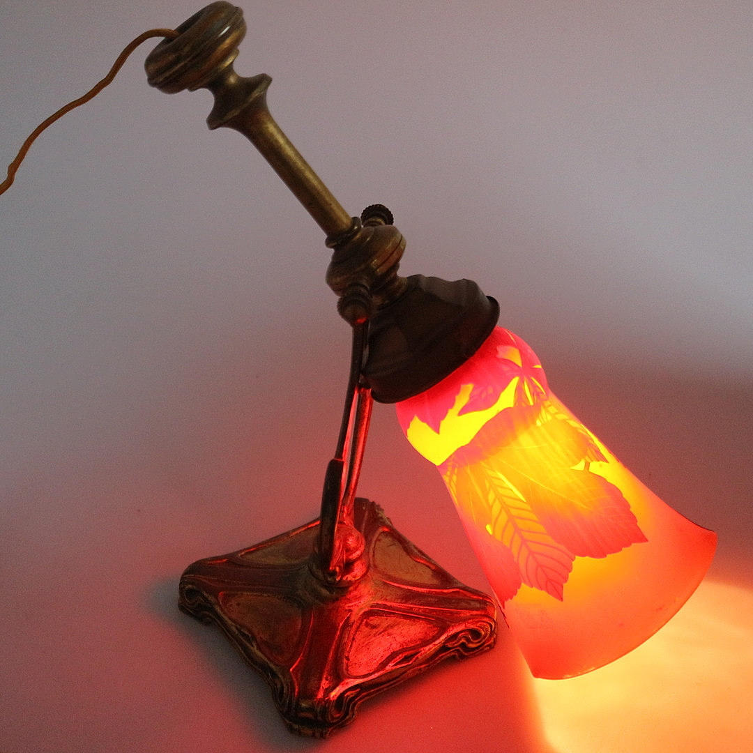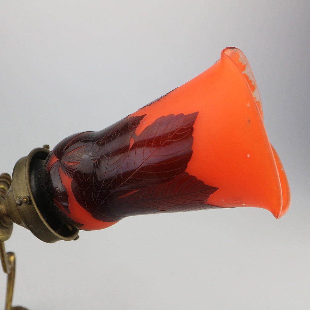 Antike Jugendstil Lampe, Bronze feuervergoldet, mit Original André Delatte Jugendstil Lampenschirm, Als Tisch- & Hängelampe verwendbar, Maße: 32 x 29 cm.