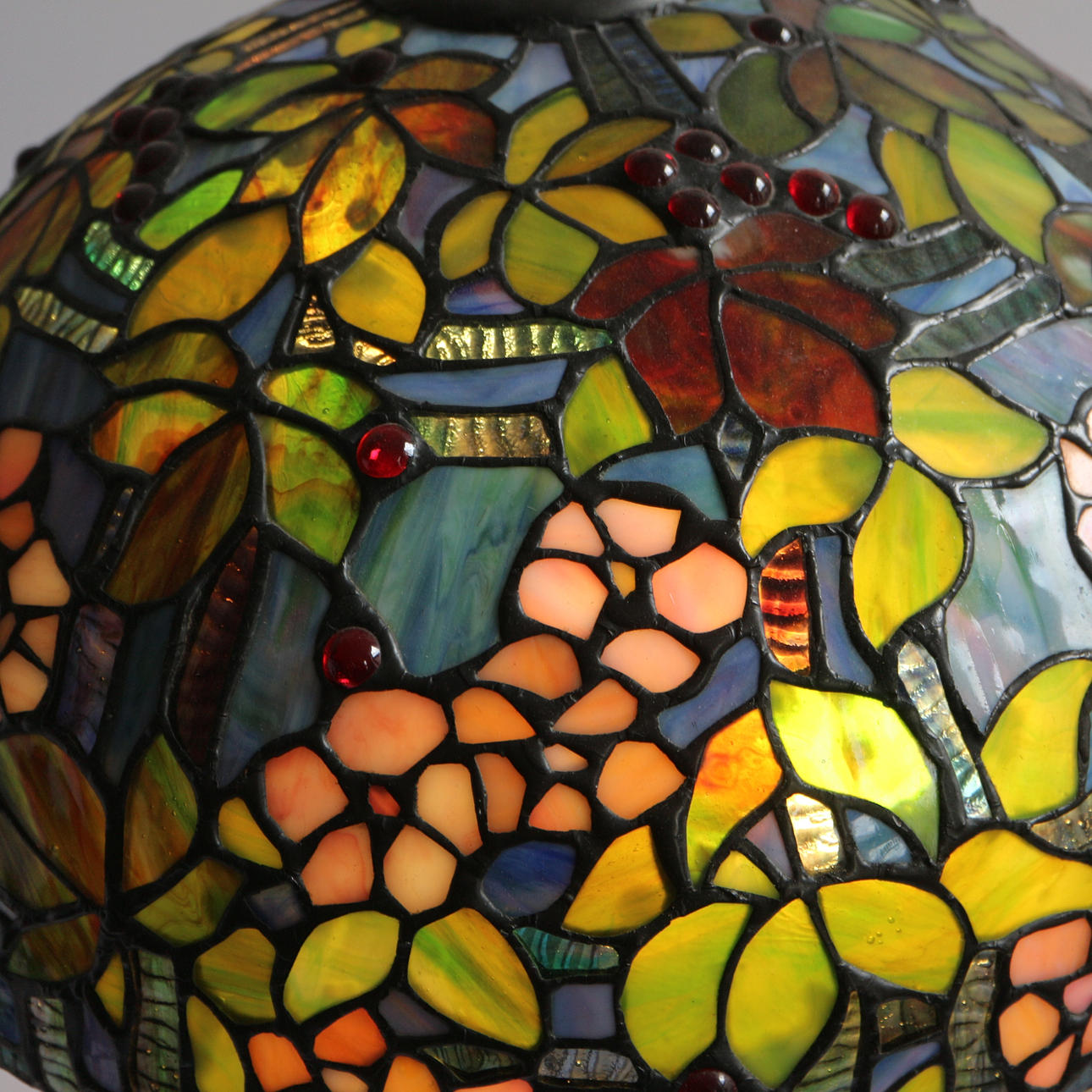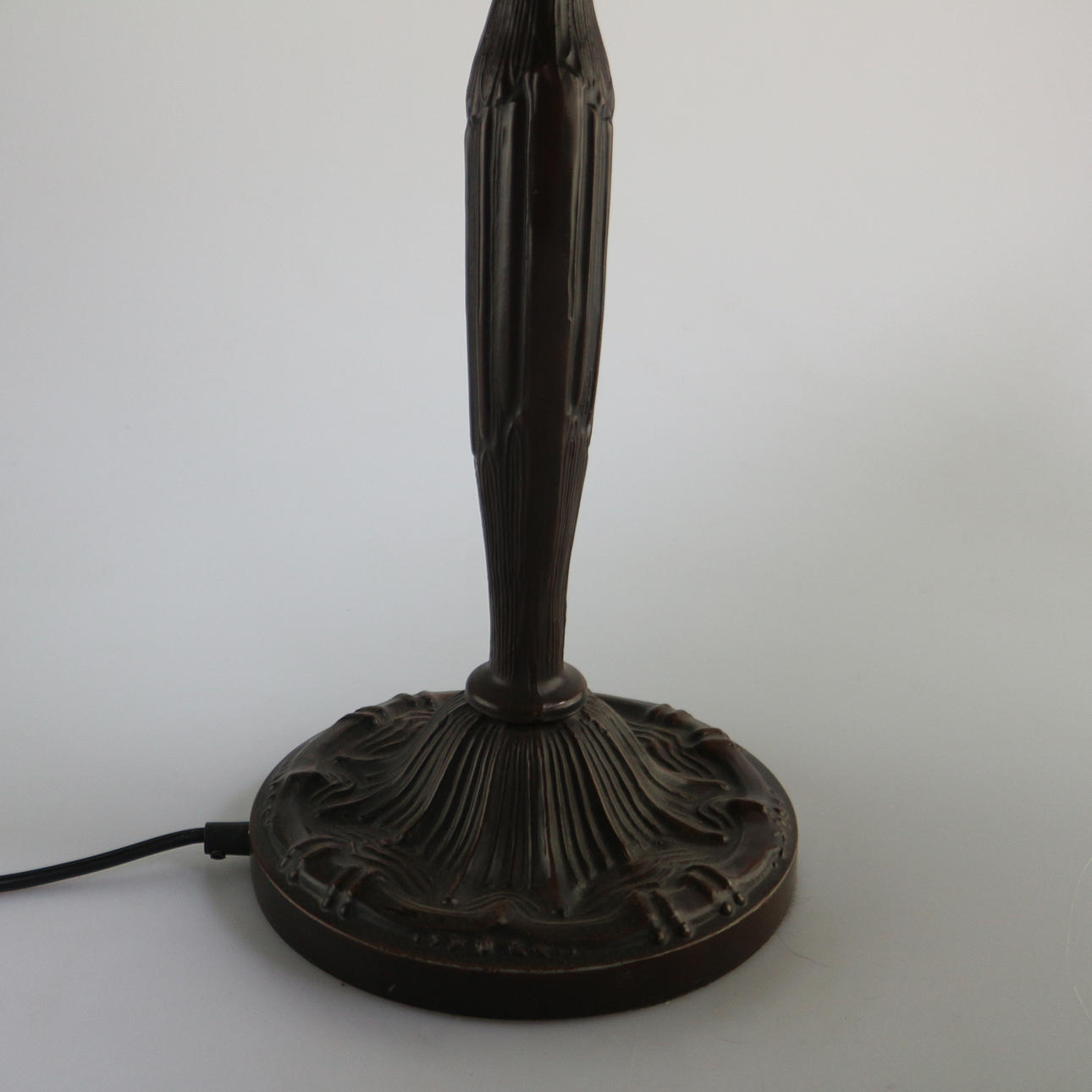 Tiffany Glaskunst im Jugendstil Lampe, florales Dekor, Bronzefuß, Opalinglas, Höhe: 63 cm, Durchmesser Schirm: 40 cm.