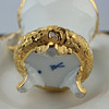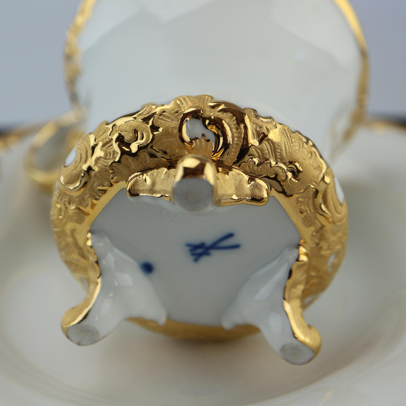 Meissen Prunk Tasse mit Unterteller, 1. Wahl, mit Golddekor, nummeriert 55971, mit Füßen, gestempelt, Höhe Tasse: 10,5 cm, Durchmesser Teller: 18 cm.