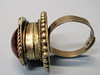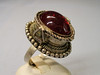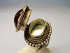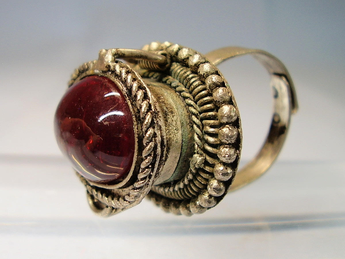 Der Ringkopf ist besetzt mit einem ovalen roten, transparenten Pastenglasstein. der von einer glatten Zarge fest gehalten wird. Der Ring kann geöffnet werden. Dadurch wird ein Hohlraum sichtbar, der Platz für Tabletten, Photos oder Ähnliches bietet.