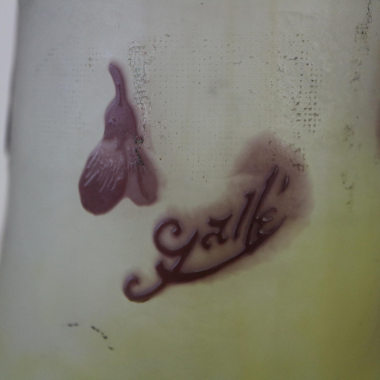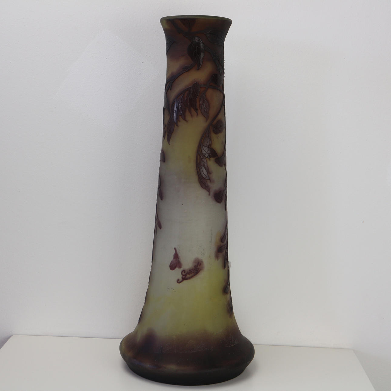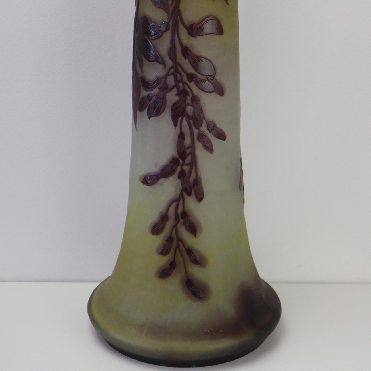 Emile Galle, Jugendstil, um 1900, Innenfang und einem herausgeätzten Überfang mit auberginefarbenen Wisteria Dekor, Höhe: 45,5 cm.