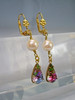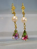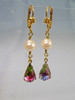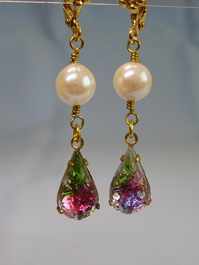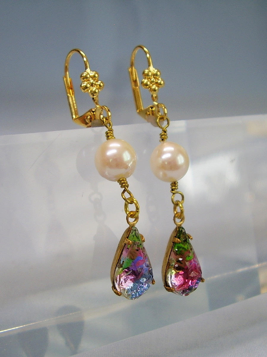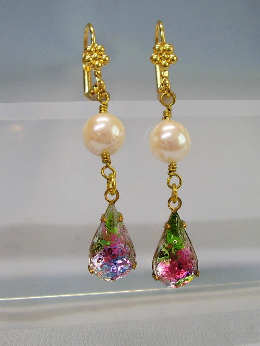 Die antiken Ohrringe sind in Schaumgold ausgeführt. An den Klapp-Ohrbügeln sind echte, weiße Akoya-Zuchtperlen in feinem Lüster und herrlichem Glanz sowie reliefierte, fein irisierende Rheinkiesel-Tropfen beweglich abgehängt.