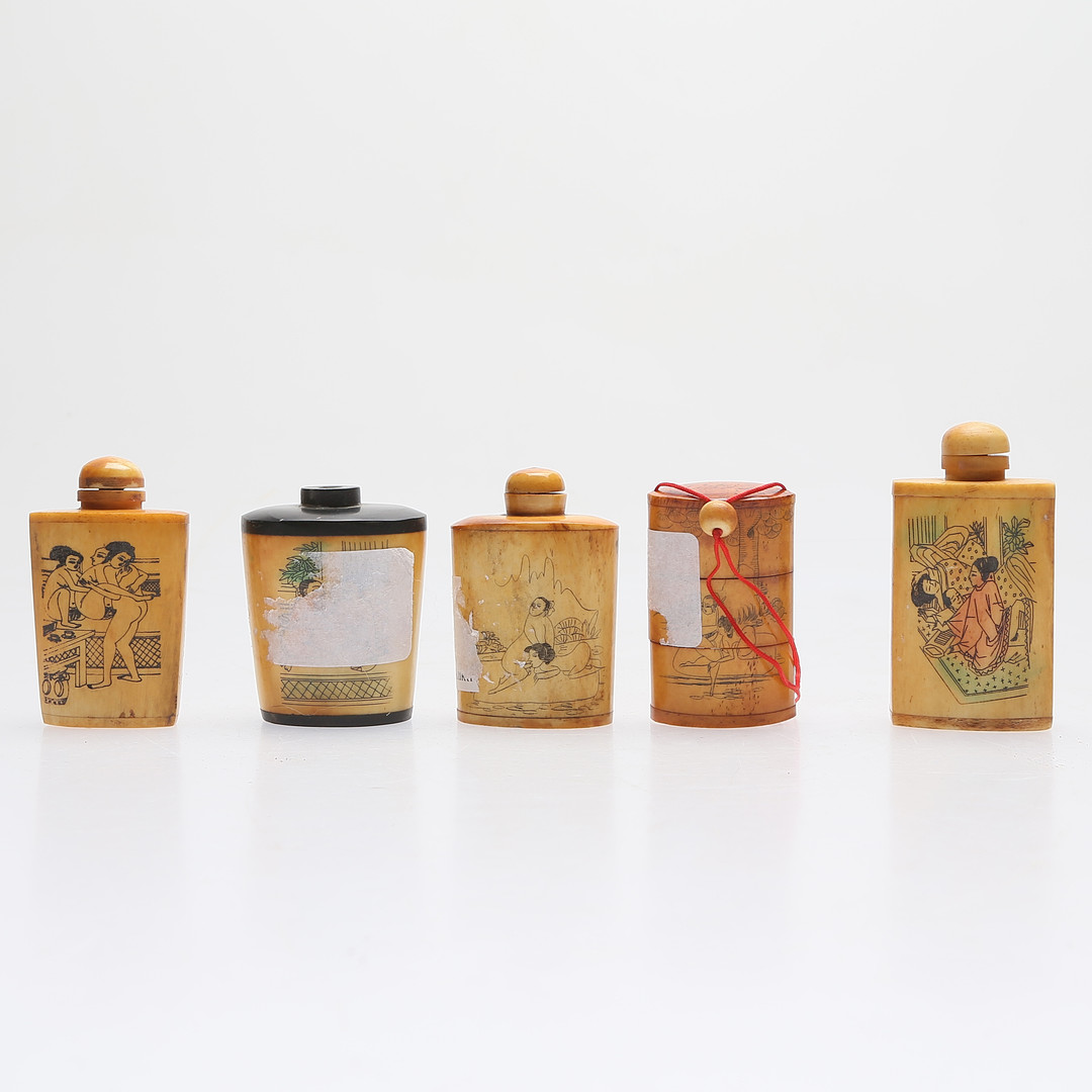 1357948. SNUFF BOTTLES, 5 Teile, Beine, 18/1900.