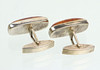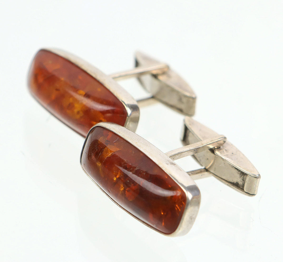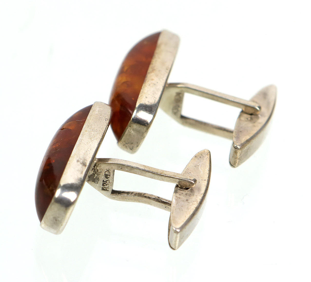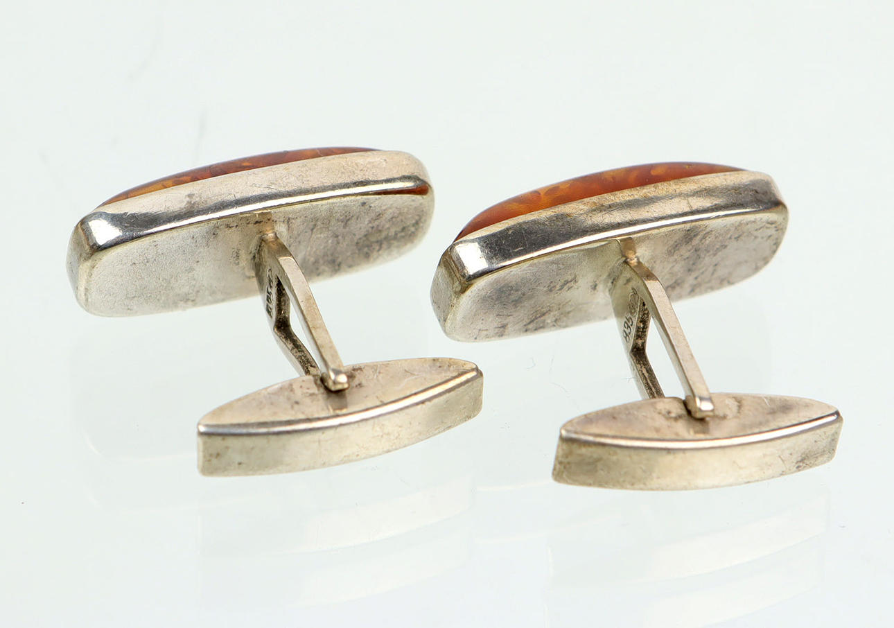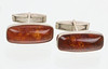 punziert Silber 835 sowie Fischland Riebnitz-Damgarten, rechteckige Form mit gemugeltem Bernstein in glatter Zarge, fein polierte Oberfläche, leicht patiniert, gut erhalten, ges. 2 Stück, ca. 11 x 25 mm, Gewicht ca. 10,5 Gramm.