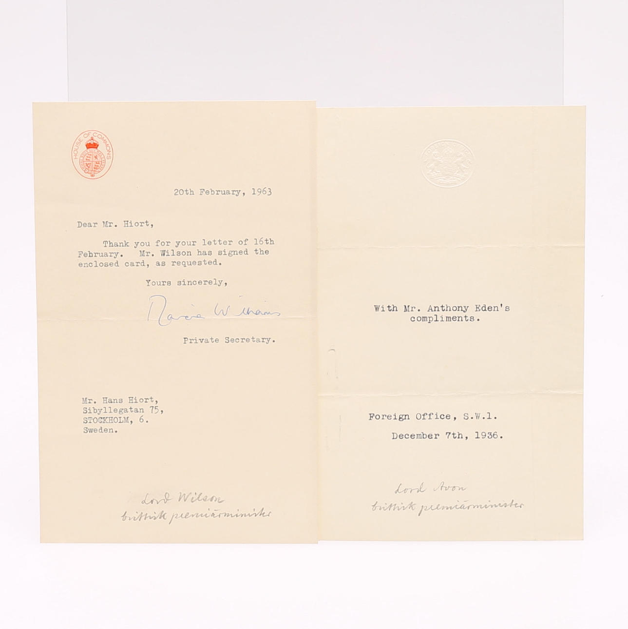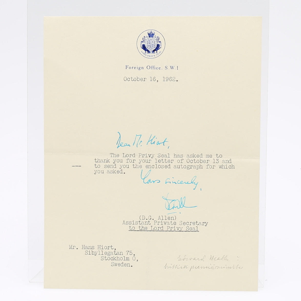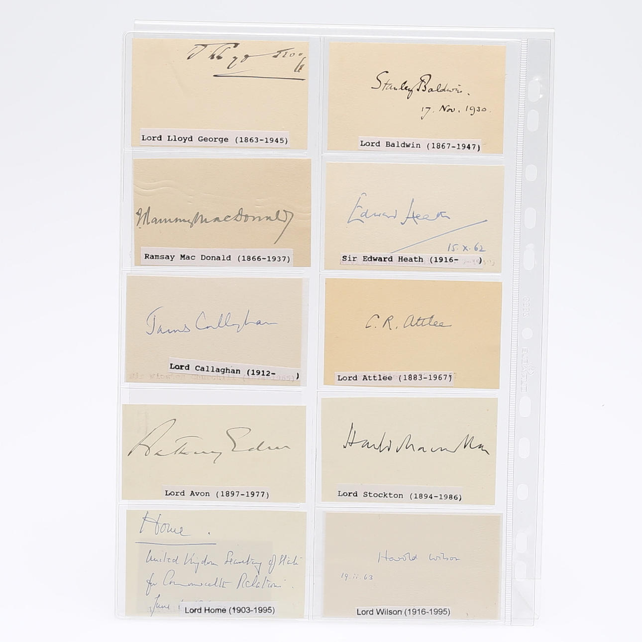David Lloyd George 1863-1945), Stanley Baldwin (1867-1947), Ramsey MacDonald (1866-1937), Edward Heath (1916-2005), James Callaghan (1912-2005), Clement Atlee (1883-1967), Anthony Eden (1897-1977), Harold MacMillan (1894-1986), Douglas Home (1903-1995), Harold Wilson (1916-1995), Arthur Balfour (1848-1930), John Major (1943-) (Foto) kommen mit Antwort Briefe von Edward Heath, Harold Wilson, Anthony Eden und Lloyd George – misst ca. 10 cm. x 8 cm - Provenienz: Sverker Hiort von Ornäs Autographensammlung.