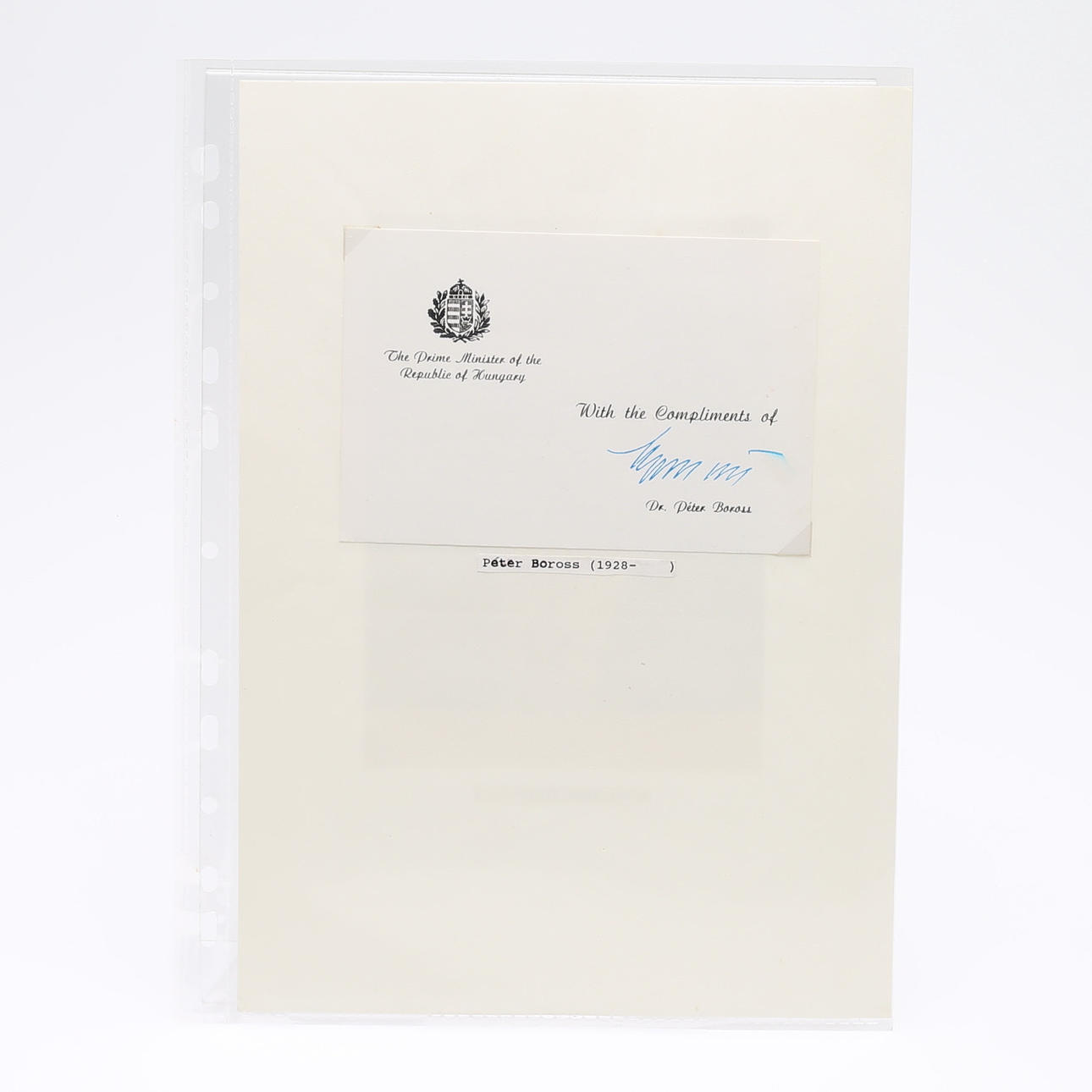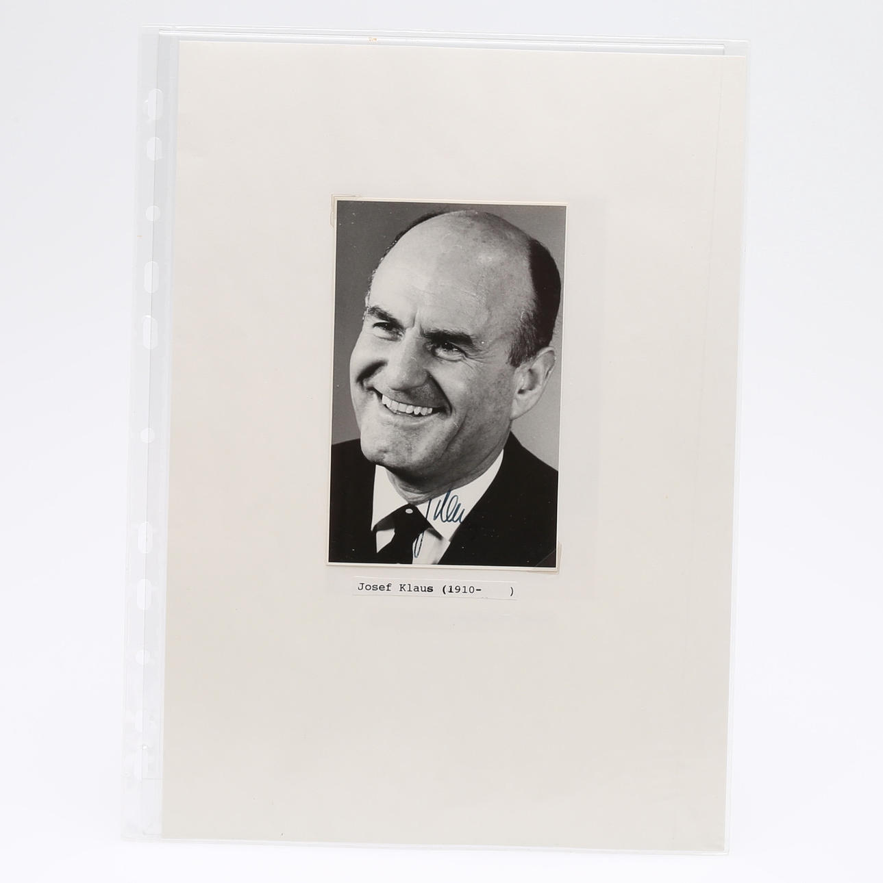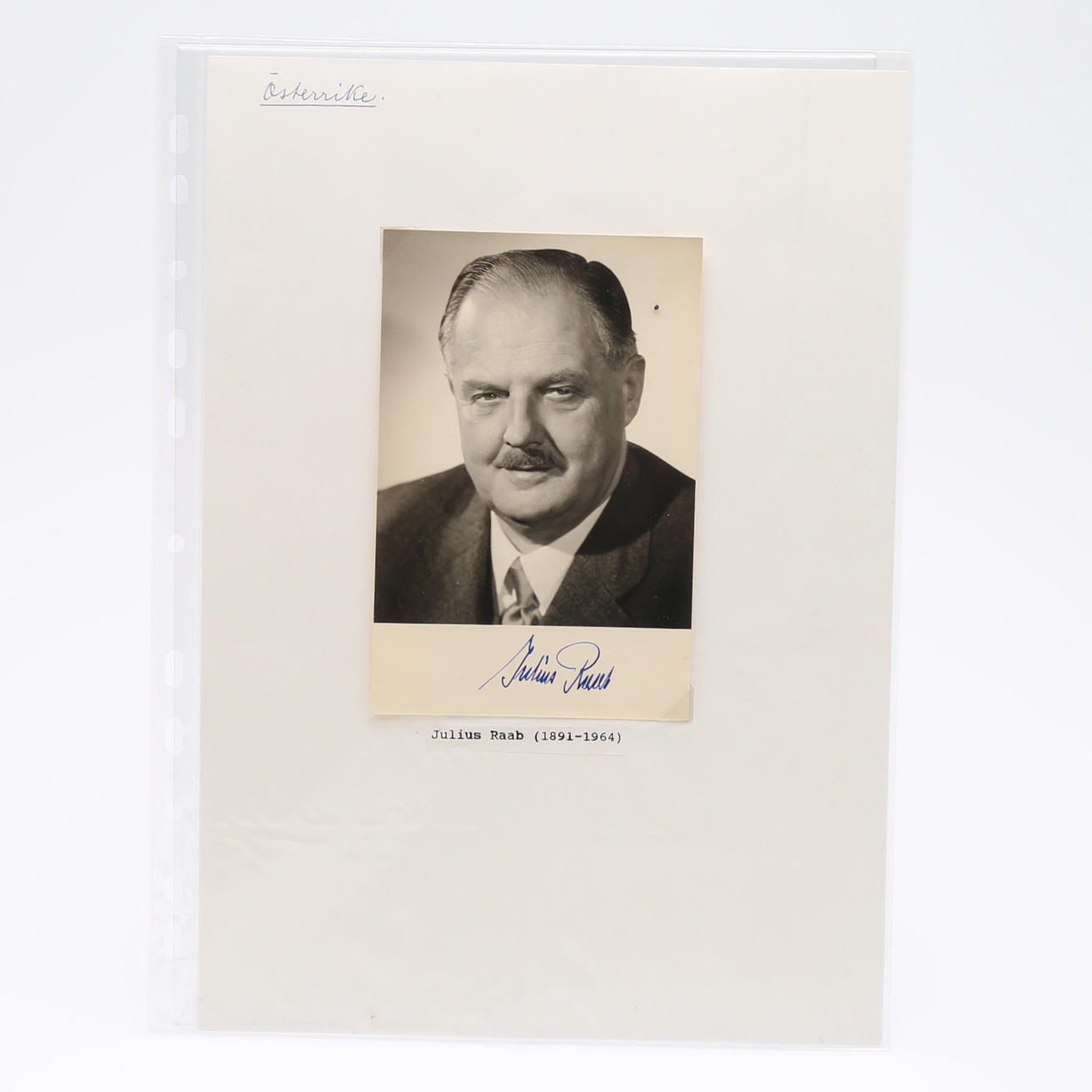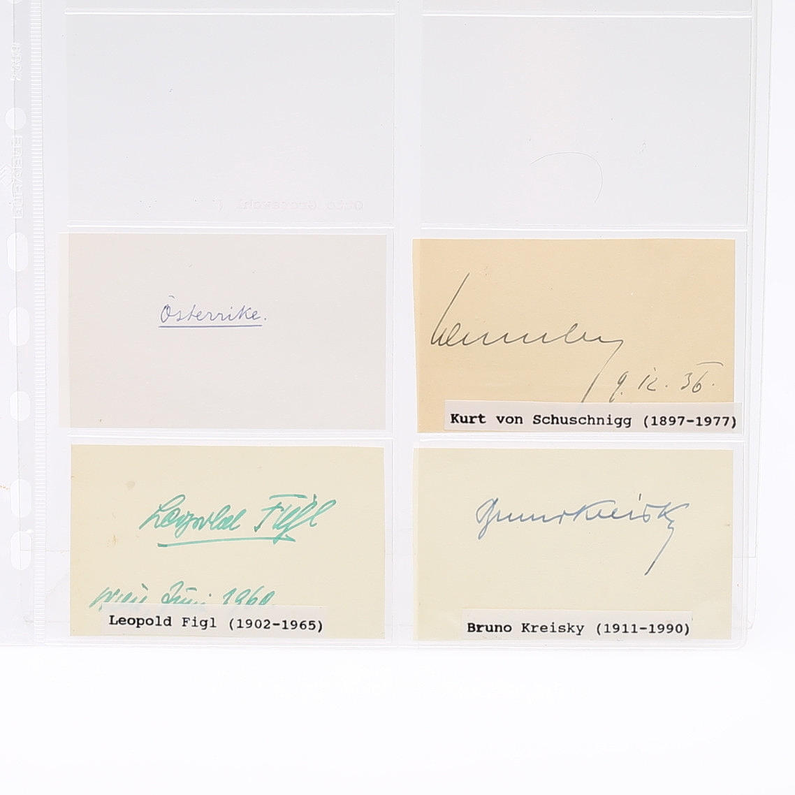 Graf Istvan Bethlen (1874-1947) – Ungarn, Jozsef Antall (1932-1993), Gyula Horn (1932-2013)(Foto) – Ungarn, Peter Boross (1928-)(Foto) – Ungarn, Miklos Nemeth (1948-) (Foto) – Ungarn, Julius Raab (1891-1964) (Foto) – Österreich, Alfonso Gorbach (1898-1972) (Foto) – Österreich, Josef Klaus (1910-2001) (Foto) – Österreich, Franz Vranitzky (1937- )(Foto) – Österreich, Kurt von Schschnigg (1897–1977) – Österreich, Leopold Figl (1902–1965) – Österreich, Bruno Kreisky (1911–1990) – Österreich, Fred Sinowatz (1929–2008) – Österreich, kommt mit Antwortbrief von Raab und Klaus - misst ca. 10 cm. x 8 cm - Provenienz: Sverker Hiort von Ornäs Autographensammlung.