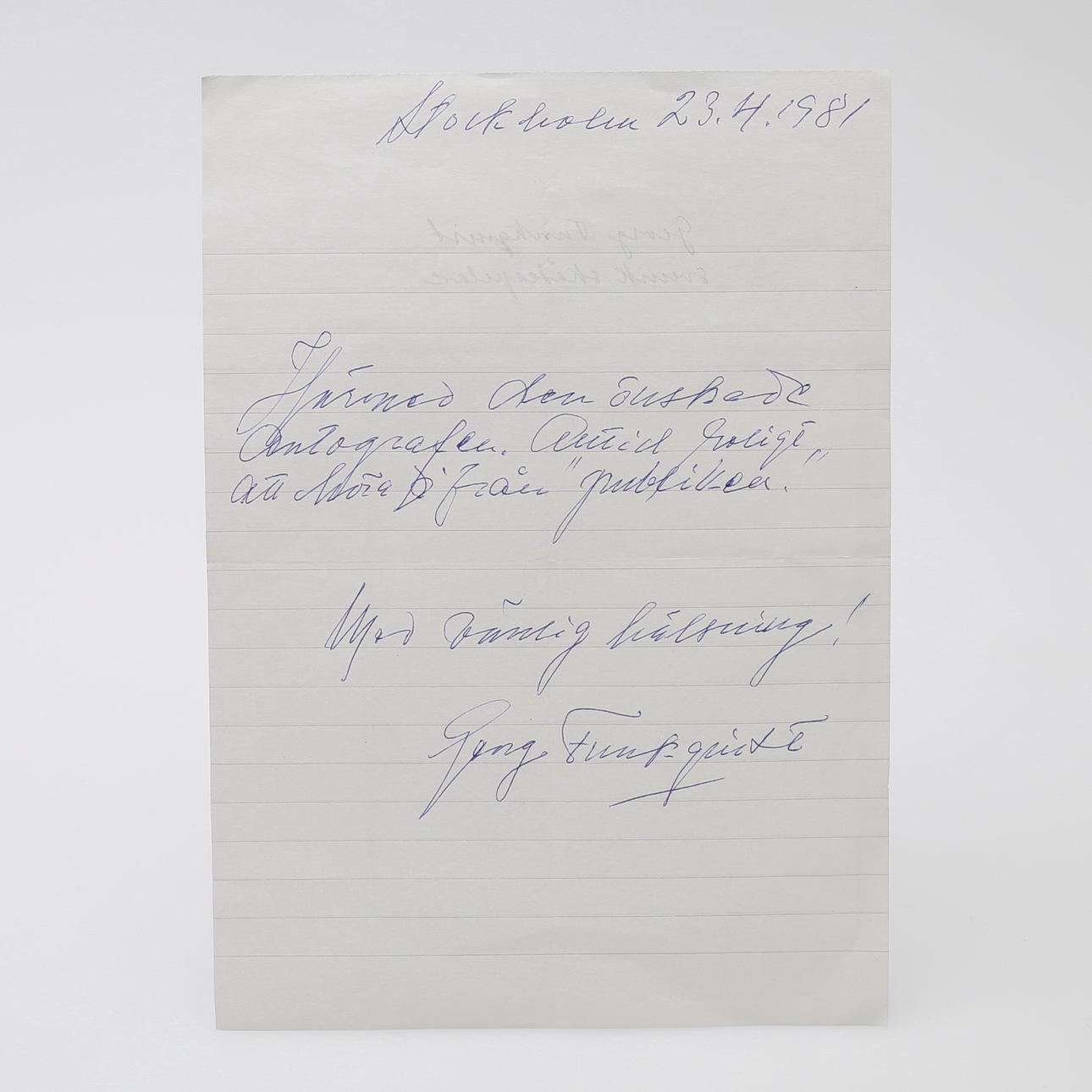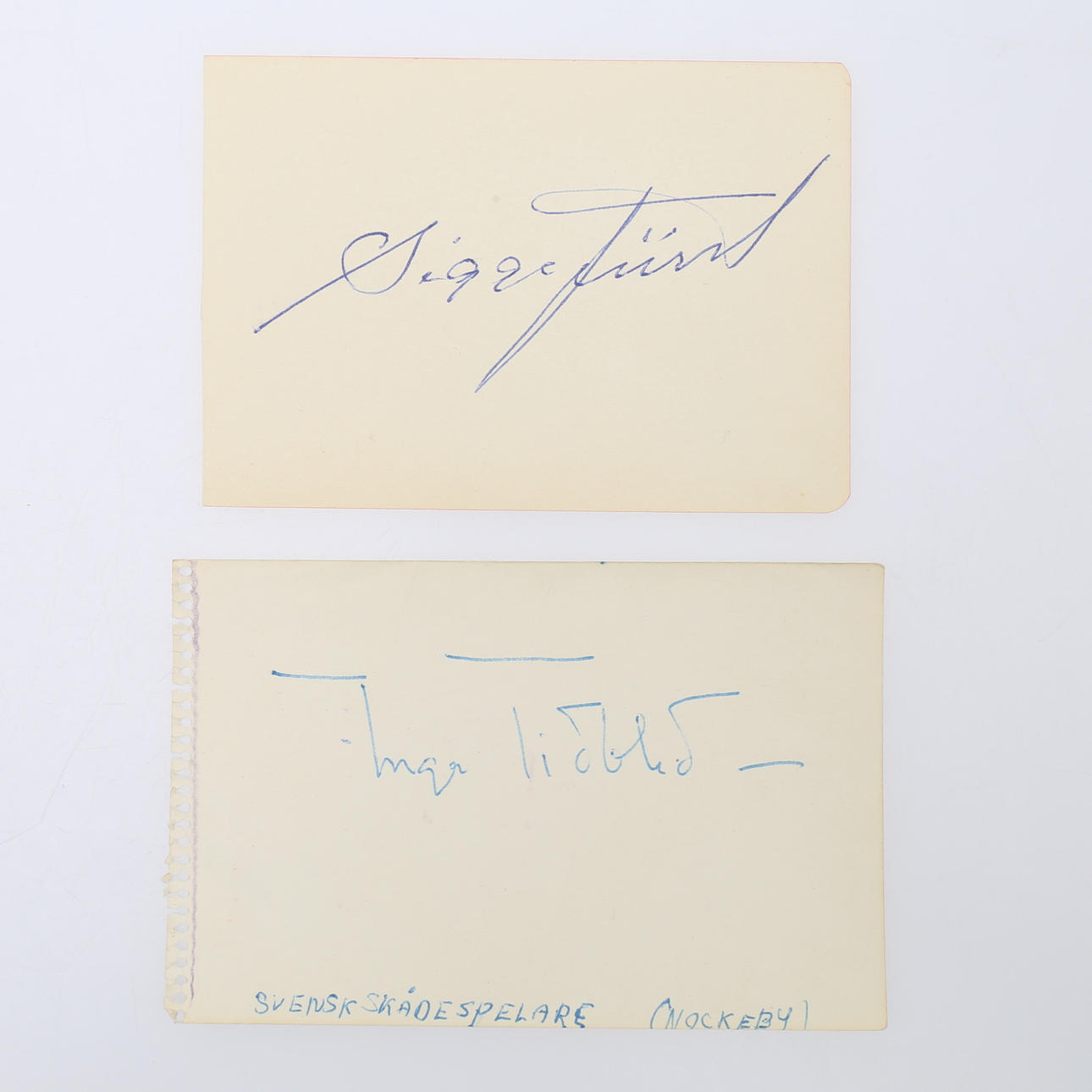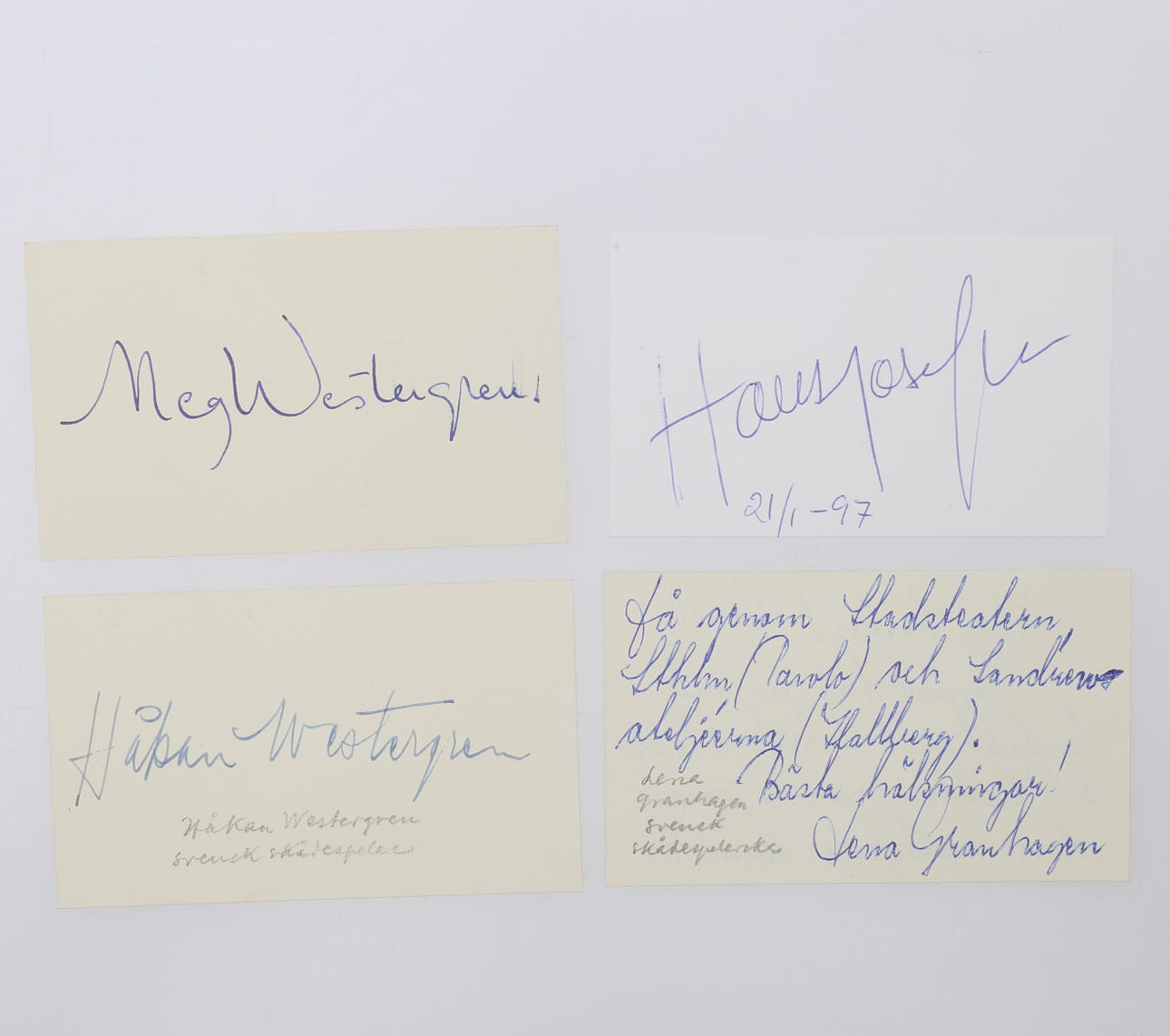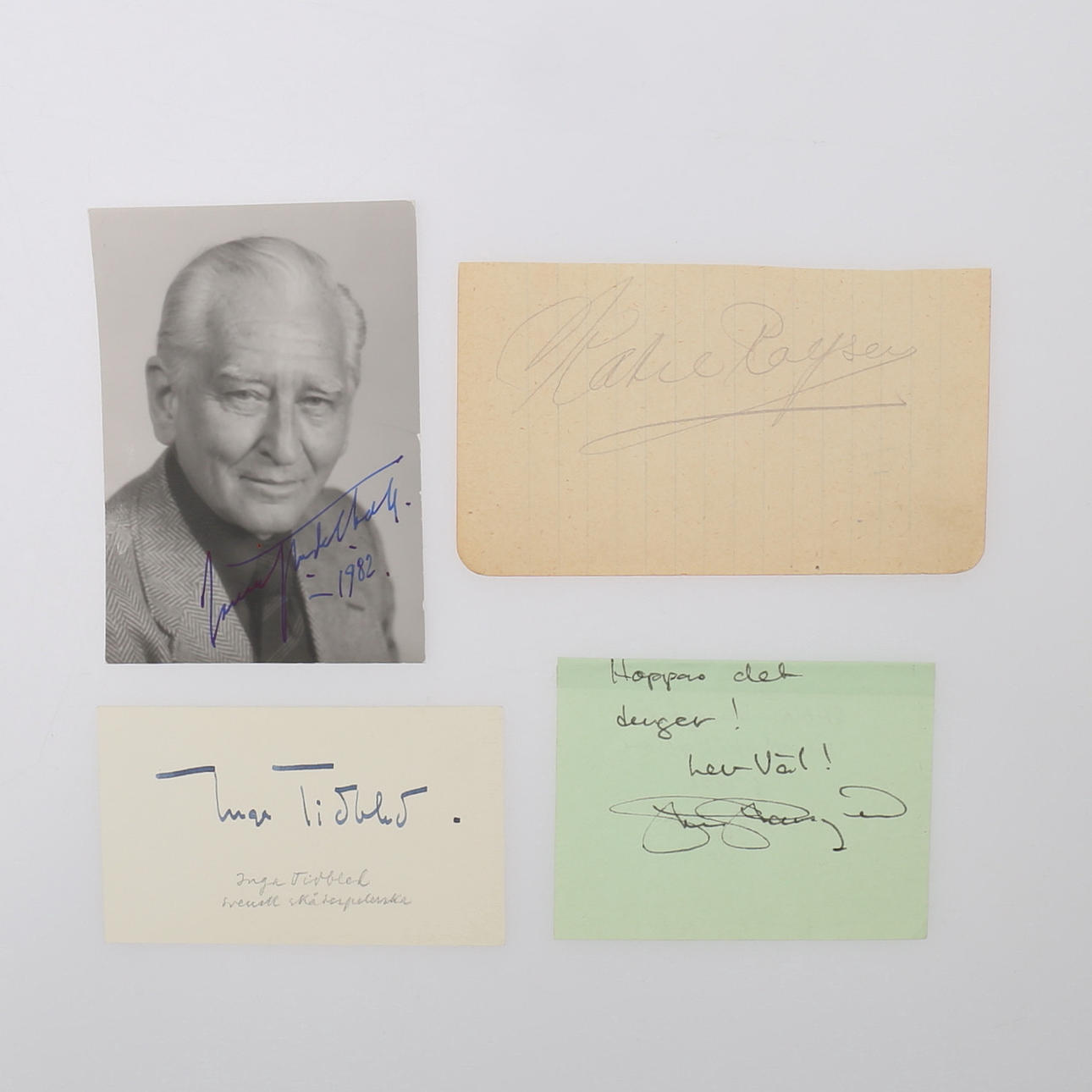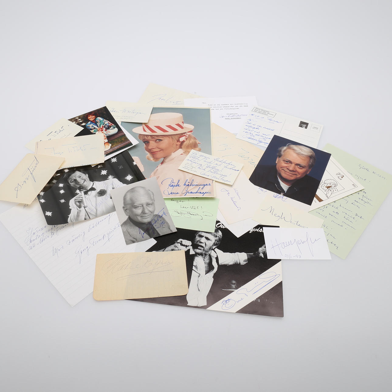Sigge Furst, George Funqvist, Lauritz Falk, Sven Wollter (Brief), Katie Rolfsen, Stellan Skarsgård, Lena Granhagen x 2, Inga Tidblad x 2, Meg Westergen, Håkan Westergren Lars Lönndahl, Thore Skogman, Gunwer Bergqvist, Janne „Lucas“ Persson , Kent Andersson, Stig Järrel, Owe Törnqvist, Jan Molander plus ein Unbekannter, - verschiedene Größen mit einigen Fotos - Provenienz: Sverker Hiort aus Ornäs Autographensammlung.