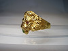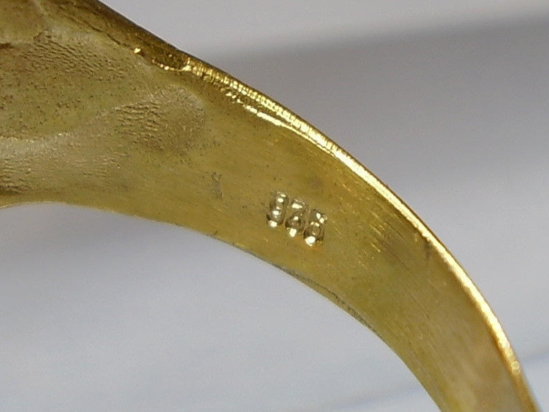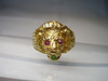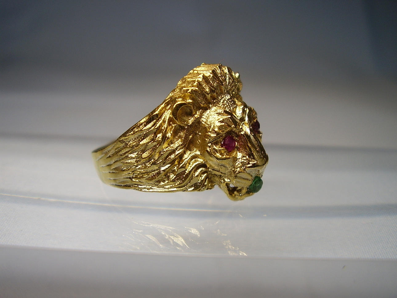 Er ist in Form eines Löwenkopfes ausgearbeitet. Als Augen sind rund facettierte, Natur- Rubine sowie im Maul ein rund facettierter Natur- Smaragd eingesetzt.