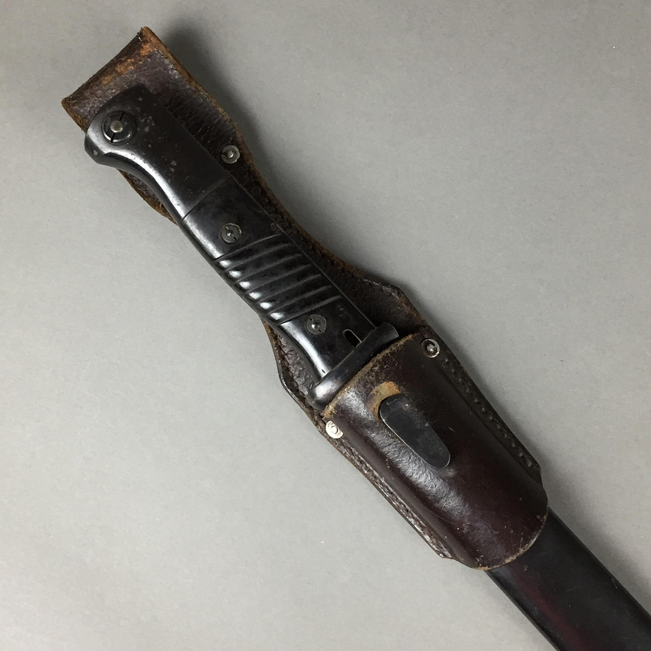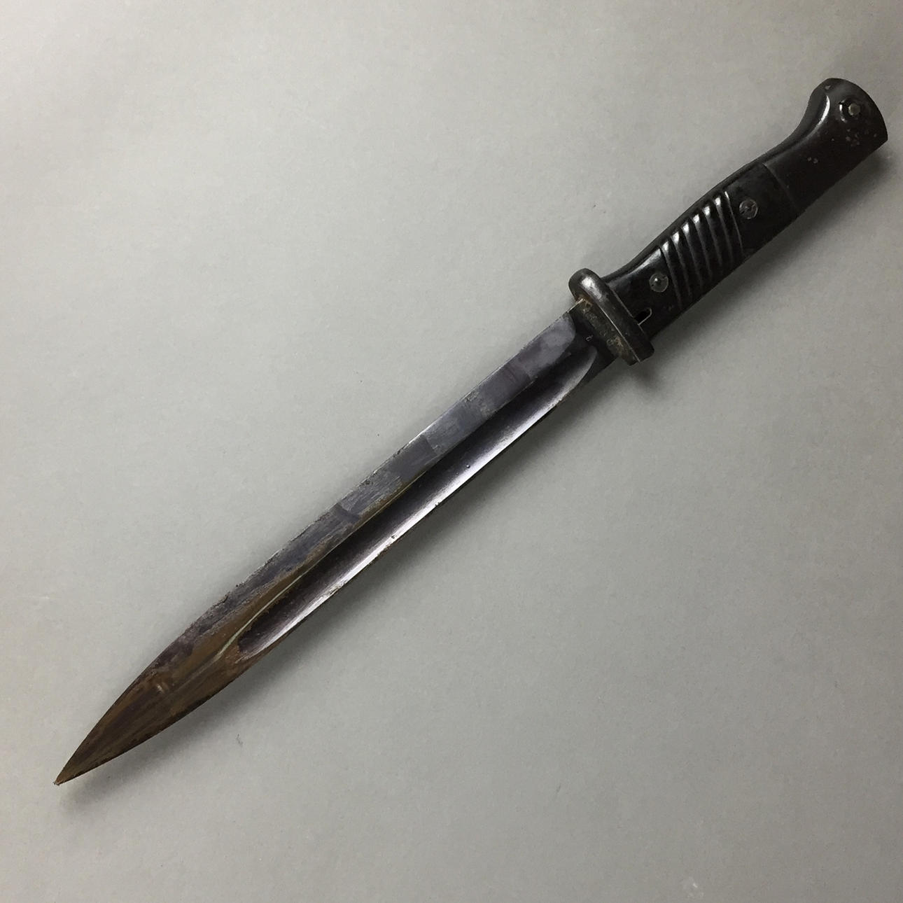 gerade, beidseitig gekehlte Rücksenklinge, eine Seite gemarkt, andere num. 8260, Bakelit-Griffschalen, Stahlscheide mit Koppelschuh, Gesamtlänge ca.40cm.