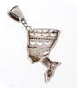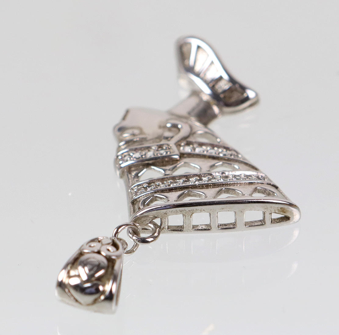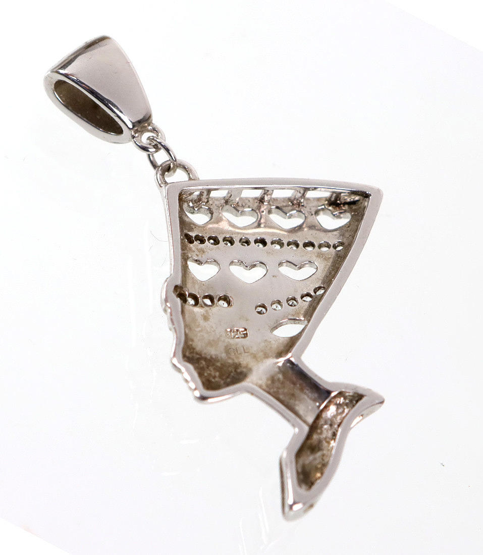 Nofretete Anhänger in Silber 925 gearbeitet so auch punziert, im Profil dargestelltes Brustbild der Nofretete, partiell durchbrochen sowie mit 20 Zirkonia im Brillantschliff ausgefasst, ca. 2,4 x 3,1 cm, Länge mit verzierter Trageöse 4,6 cm, Gewicht 5,5 Gramm.