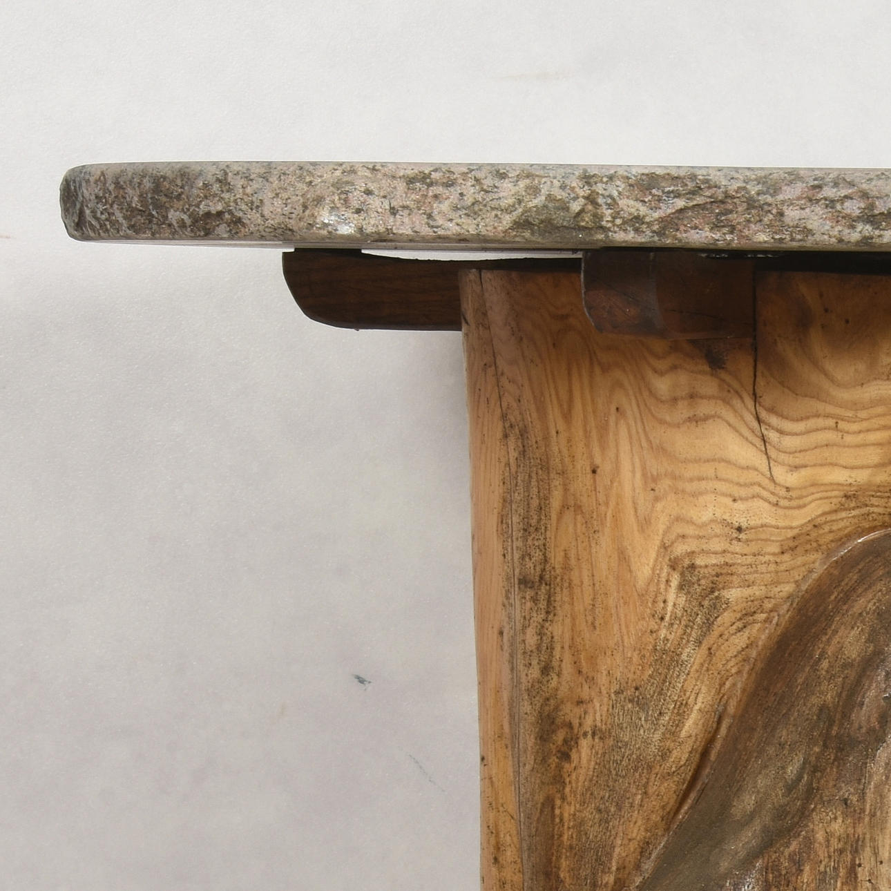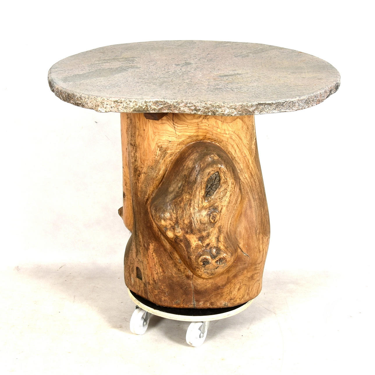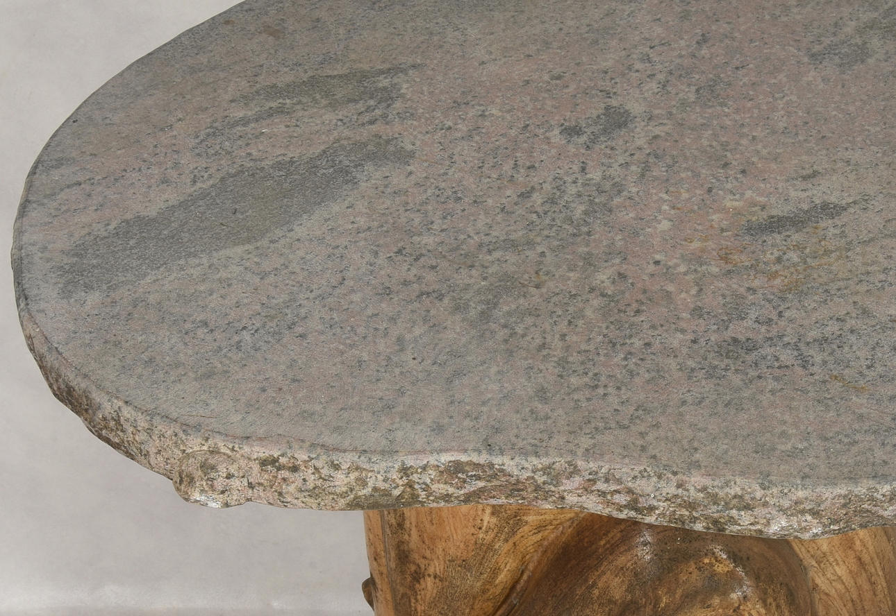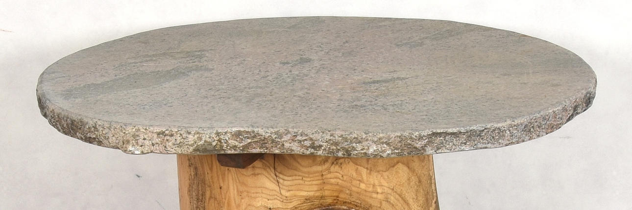 1384669. GARTENTISCH, Baumstamm mit Steinplatte, spätes 20. Jahrhundert.