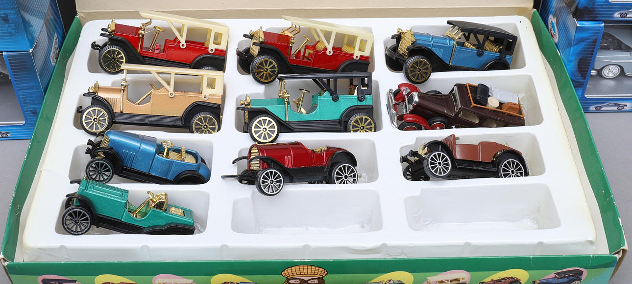 Box mit Oldtimer, Metalldruckguss, 9 Autos.