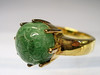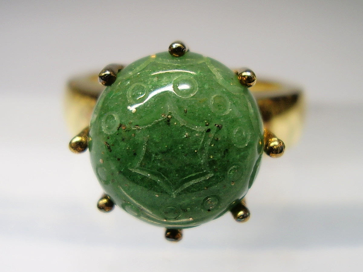 Der Ringkopf ist besetzt mit einem runden Natur Smaragd von 7 ct., handgraviert mit geometrischen Ornamenten.