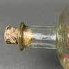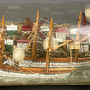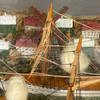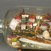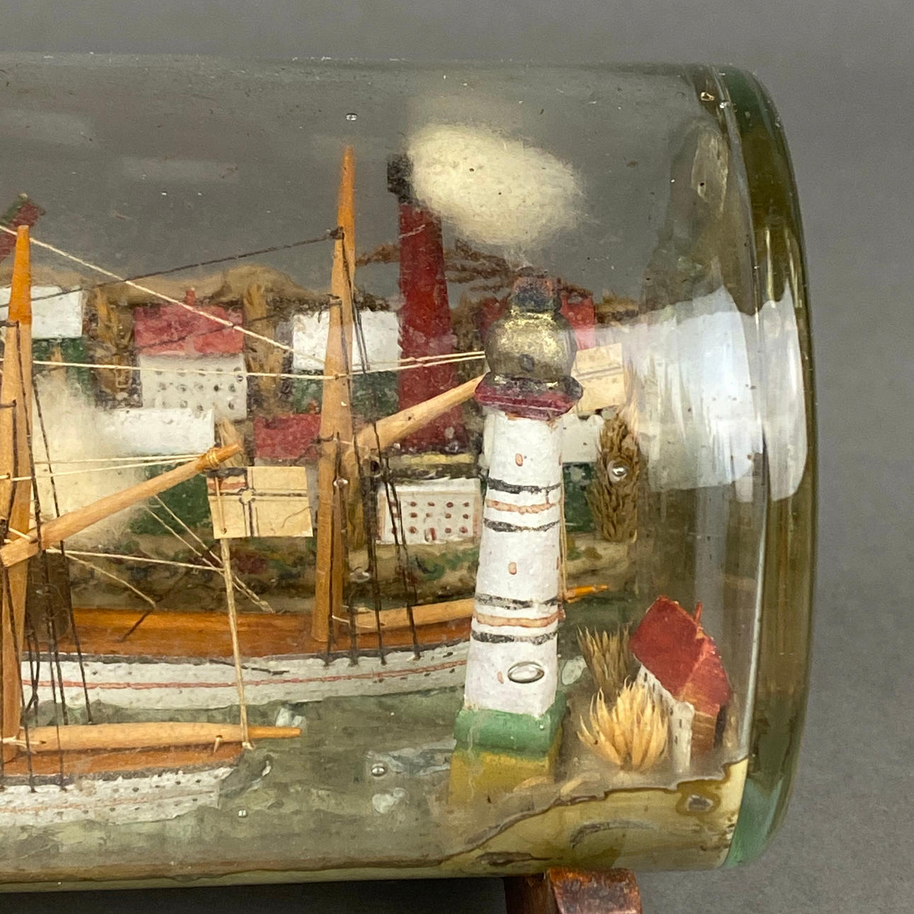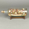 Buddelschiff - Glas/Holz/Masse/etc., bemalt, in farbloser Glasflasche zwei Segeldampfer auf modelliertem Wasser im Hafen einer Stadt mit bunten Häusern, Windmühle und Leuchtturm, Windmühle mit Datierung "1901", auf Holzständer, HxL (mit Ständer): ca. 10,5x25,5cm.