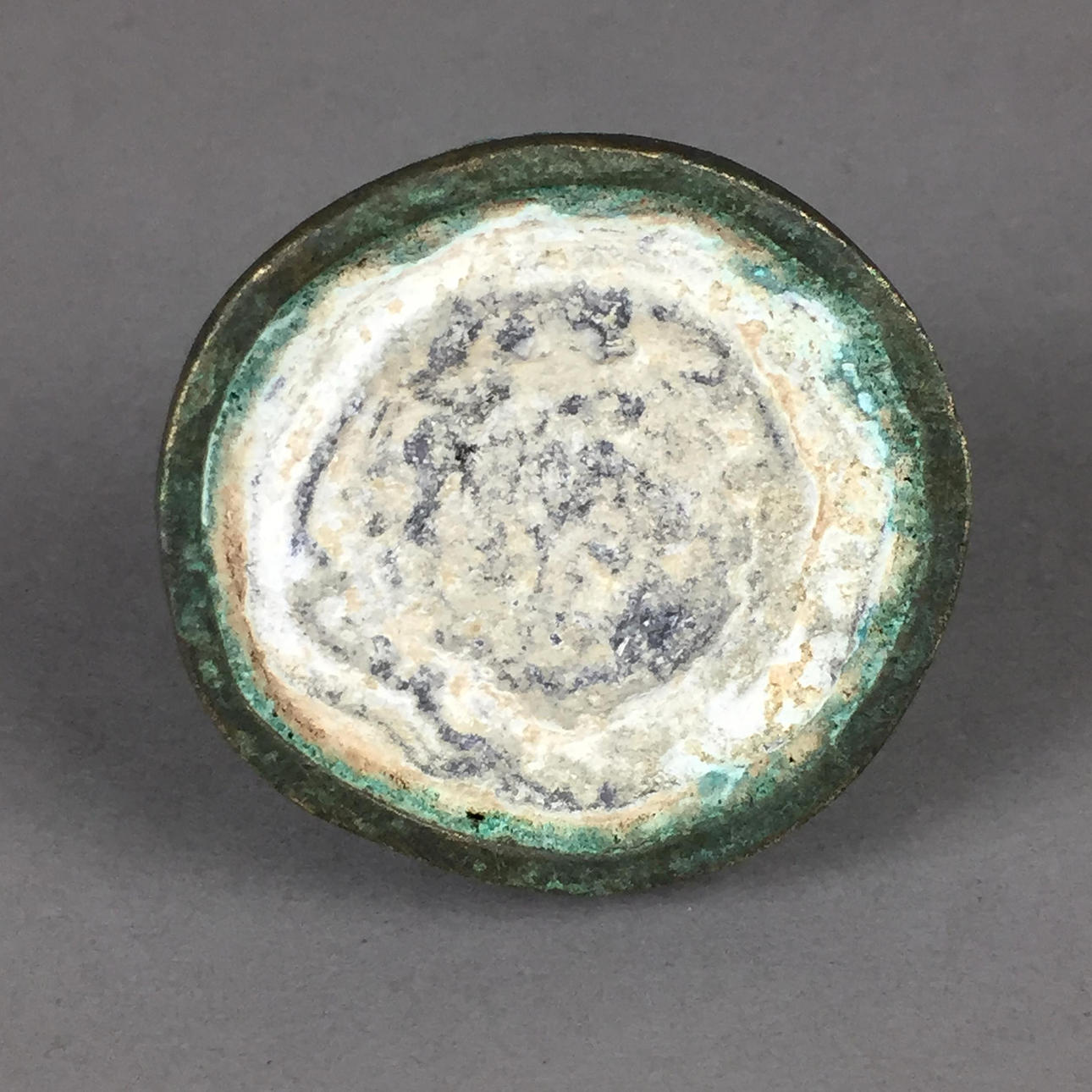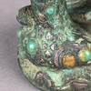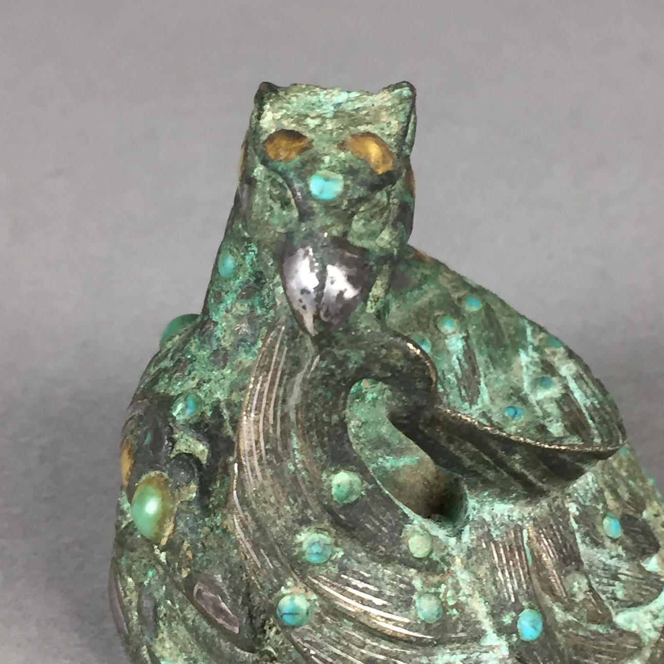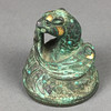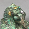 Verzierter Bronze-Knauf - China, im Stil der Han-Dynastie, hochkupferhaltige Bronze mit Einlagen aus Gold-/Silbermetall und Türkisen, plastische Darstellung eines zusammengekauerten Phönix, sich das Gefieder putzend, H.ca.5,5cm, ca.530g.