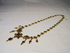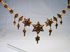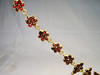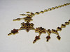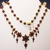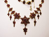 Das Collier ist aus einer Kette aus Granat-Sternen gearbeitet, die zu einem mehrstöckigen Sternen-Mittelteil hinführen, von dem Granat-Trauben in gestaffelter Größe beweglich abgehängt sind,. Auch die Schließe ist mit Granat besetzt und hat zur Sicherheit ein eigenes Sicherheitskettchen.