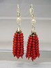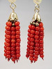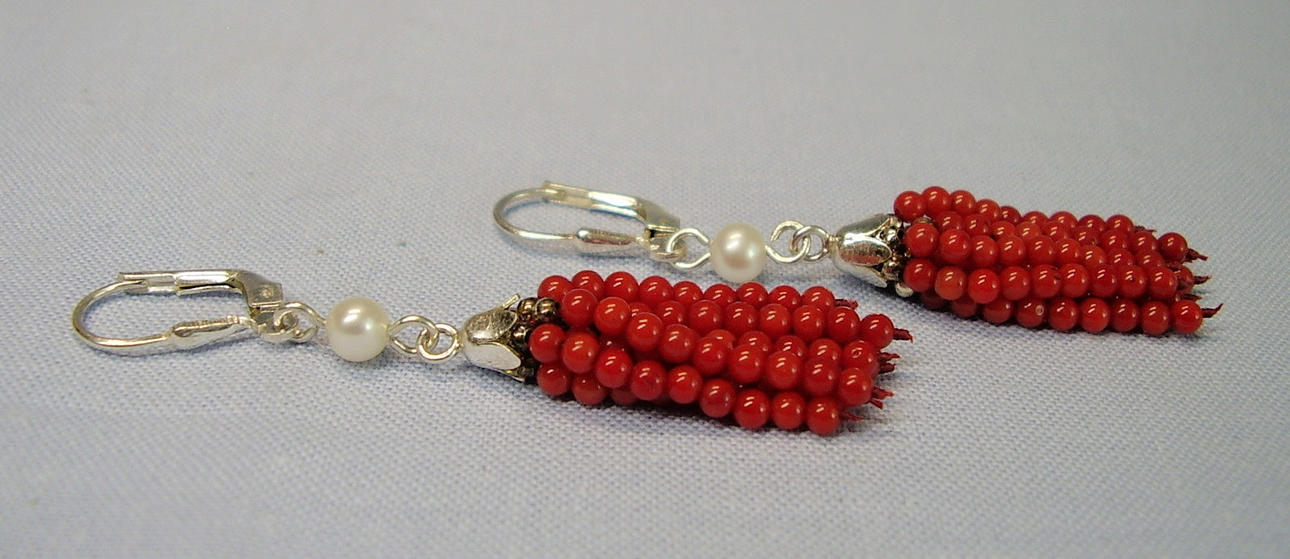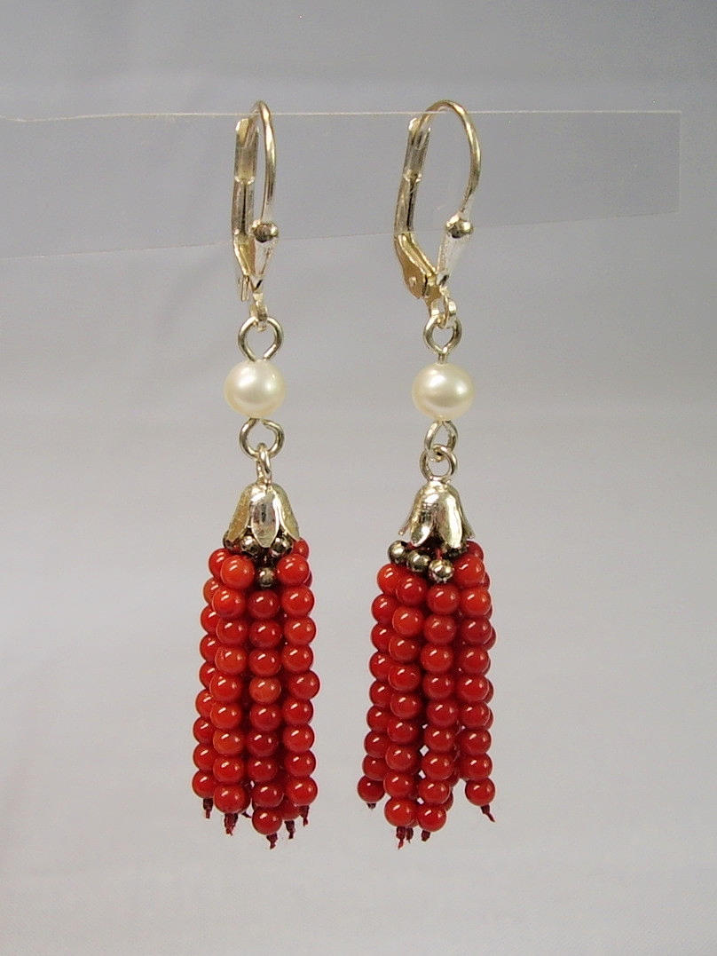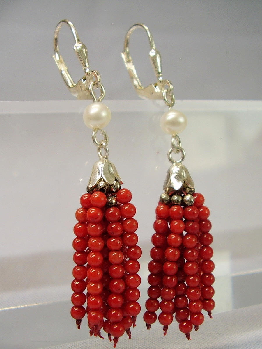 Die handgearbeiteten Ohrringe sind in Silber 925 ausgeführt und punziert. Sie sind mit Klapp-Ohrbügeln ausgestattet, die eine echte, weiße Zuchtperle sowie 9-strängige Quasten aus feinen roten Korallen-Perlen tragen.