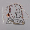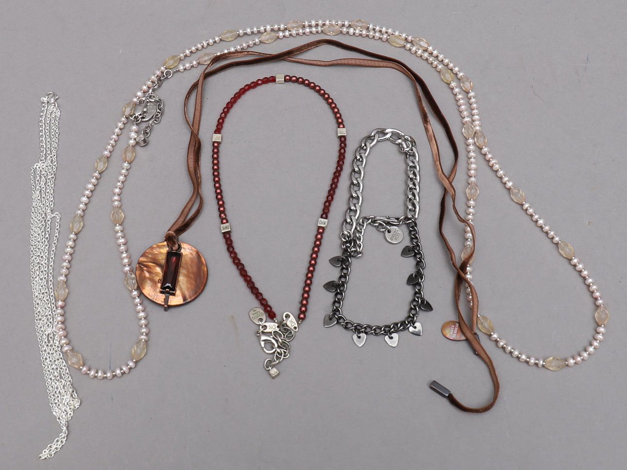 Dyrberg Kern: Kette, hellrosa Perlen, Länge ca. 120 cm im Umfang Kette, rote Perlen, längste Länge ca. 45 cm Armband, Metall mit herzförmigen Anhängern, längste Länge ca. 22 cm Kette, Stein und Textil, Krawatte, längste Länge ca. 90 cm Ungemarkter Schmuck: Halskette mit geschliffenem Stein, Länge ca. 47 cm Halskette mit drei Ketten, Weißmetall, Länge ca. 45 cm Kette mit Anhänger in Blütenform, Metall, Gliederlänge ca. 46 cm, Länge des Anhängers ca. 4,5 cm Kette mit Anhänger, Metall, polierter Stein und gemusterte Kunststoffkugel, Länge ca. 52 cm, Länge des Anhängers ca. 4 cm Maison Scotch la femme selon mare: Kette mit Anhänger, Metall, Länge ca. 34 cm, Anhängerlänge ca. 3 cm.