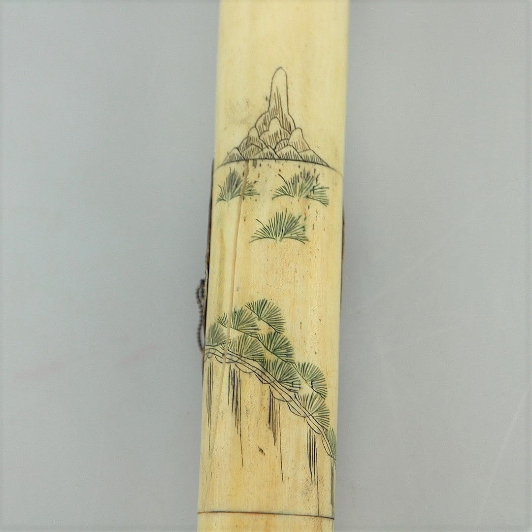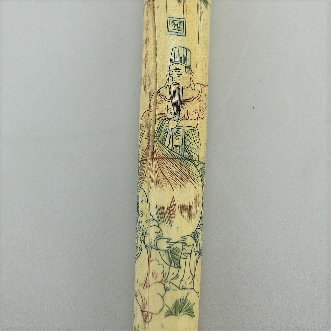 Opiumpfeife, China, 19./20. Jh., Bein, Horn, Holz und Kupfer, gerades Beinmittelstück, verziert mit Pflanzen und Schriftzeichen, als Abschluss gedrechselte Holzteile, L: 42 cm.