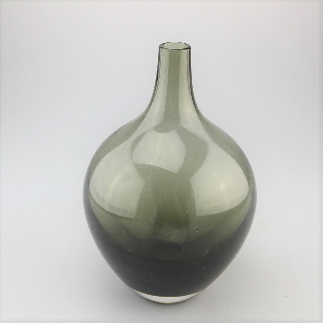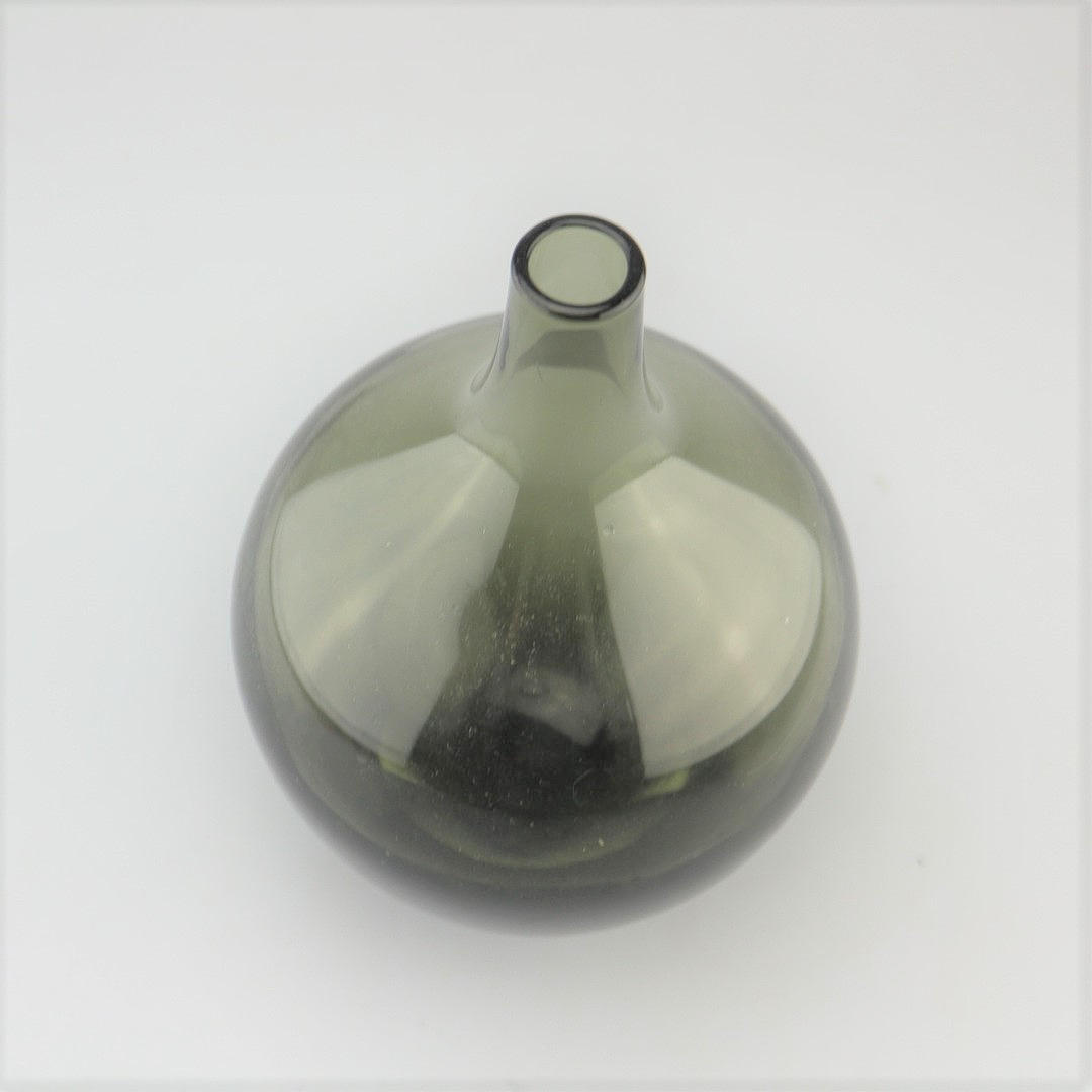 Glasvase von WMF nach dem Entwurf von Wilhelm Wagenfeld, 1950er Jahre. Turmalin-farbiges Glas, breiter Korpus.Höhe: 20,5 cm.