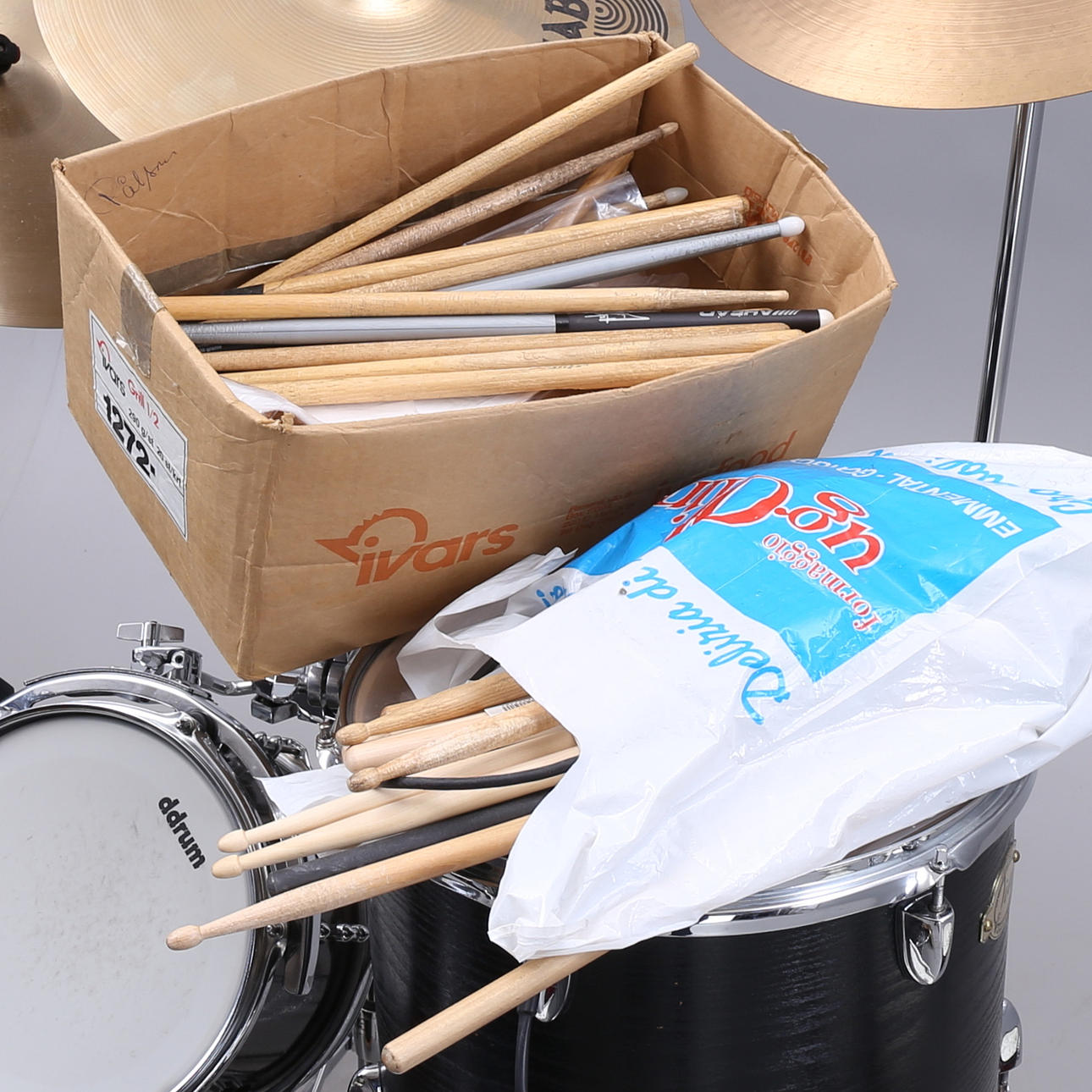11 Trommeln, 9 Ständer, 4 Becken, Trommelstuhl und Zubehör.