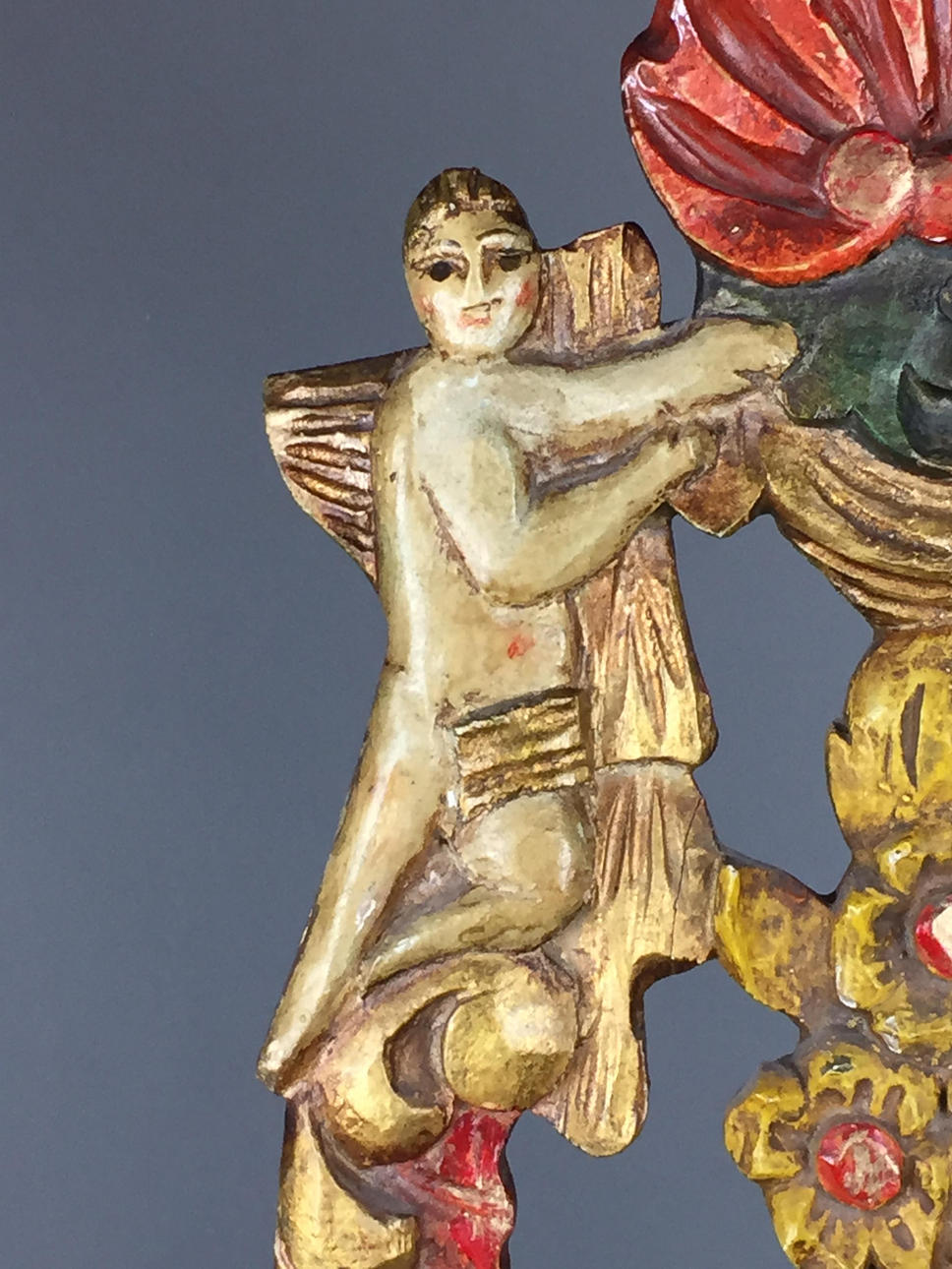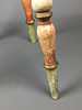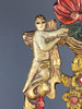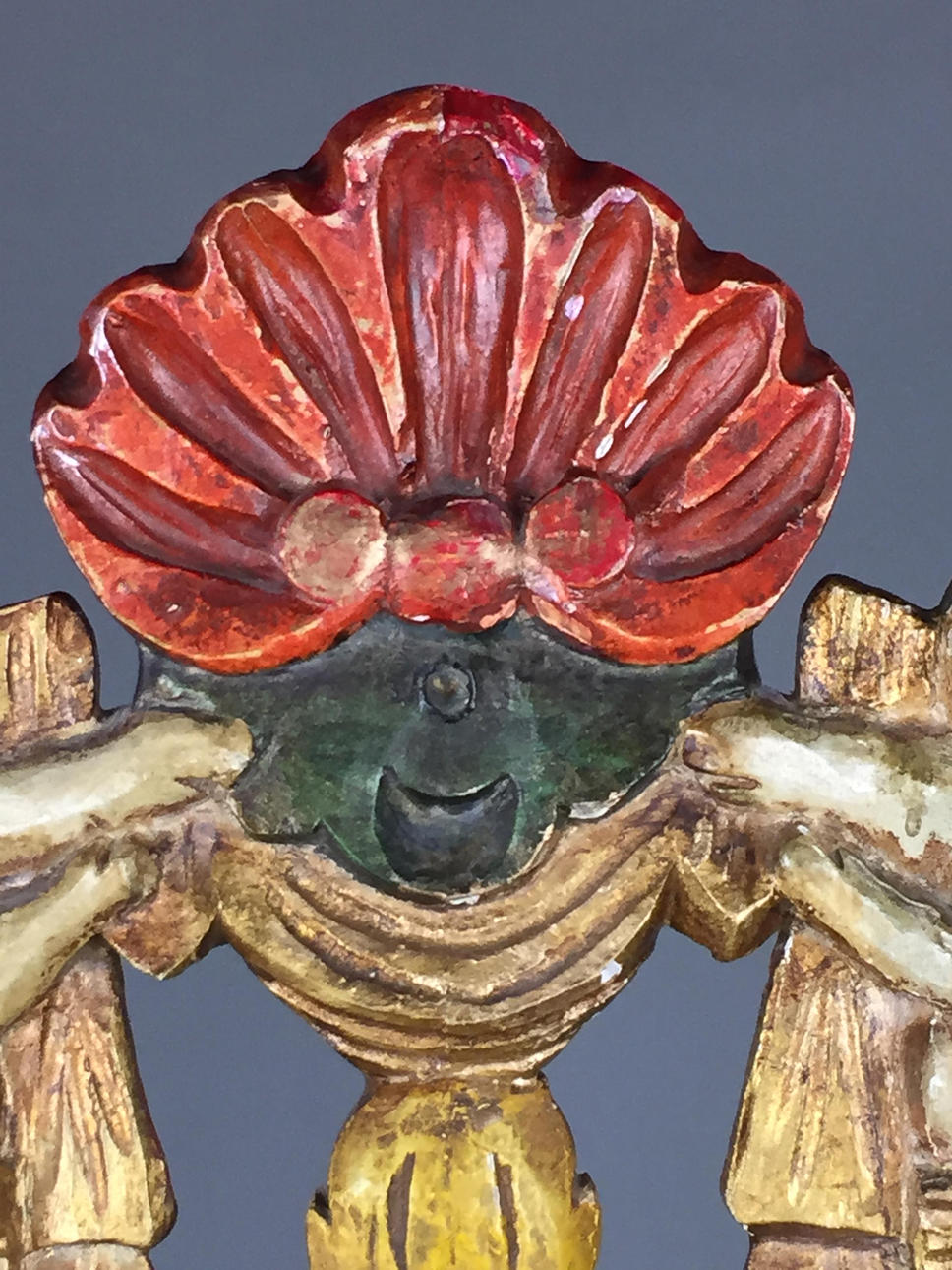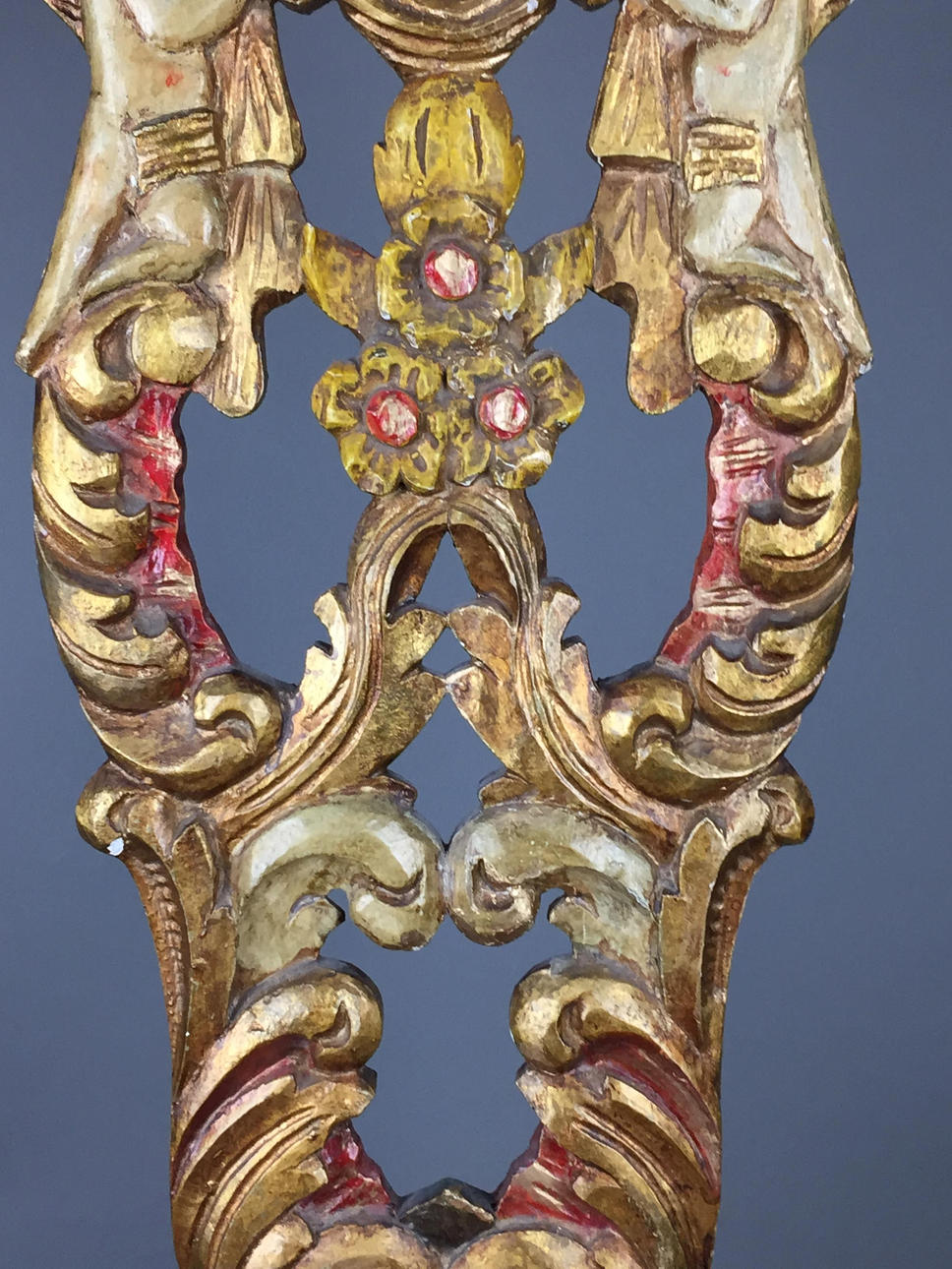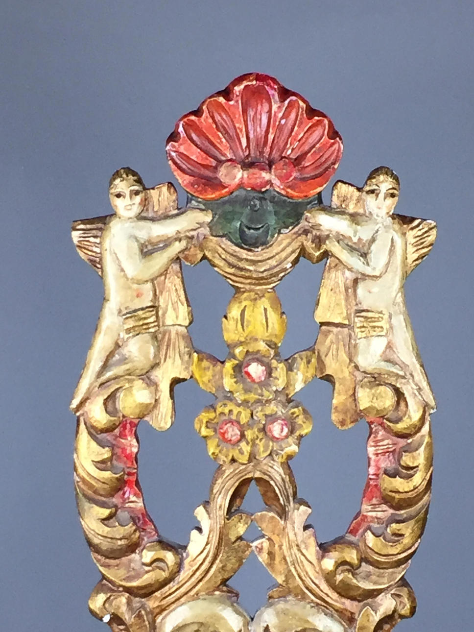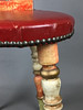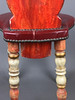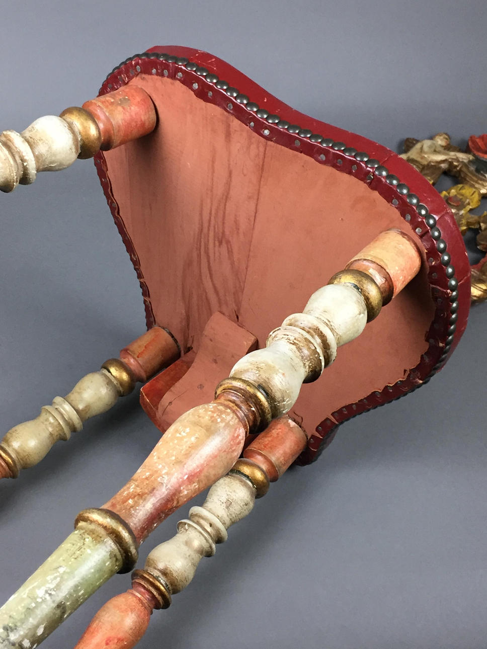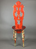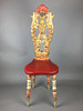 Bauernstuhl - Holz, geschnitzt, farbig gefasst, gedrechselte Beine, Rücken mit Ranken geschnitzt mit Rocaillen-, Ranken und Muschelndekor sowie zwei Putti, rote Sitzbespannung mit Nieten, Sitzhöhe ca. 45cm, Gesamthöhe ca.106cm.