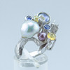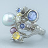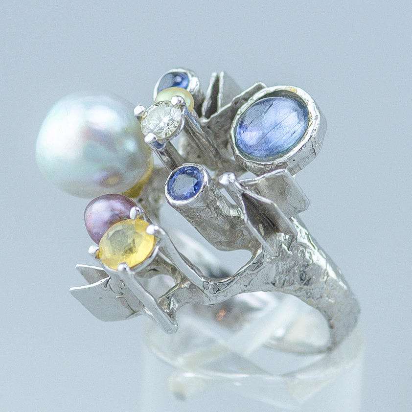 585/14k white gold with three pearls, two topaz cabochons, one spinel, one tourmaline and one diamond.