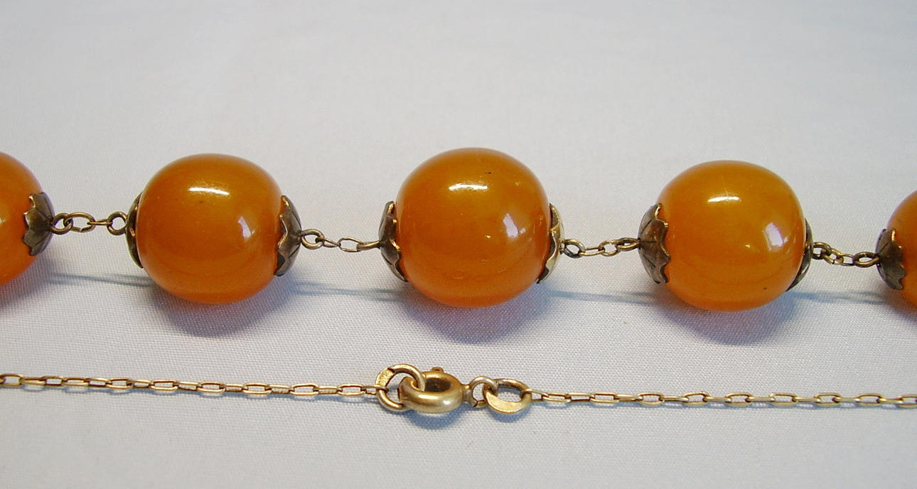 Antike russische Bernstein-Silberkette mehrfach punziert (u.a. auf der Öse vor dem Verschluss) mit der russischen Silbermarke mit 875 sowie der Vergoldungsmarke von 8 Karat.