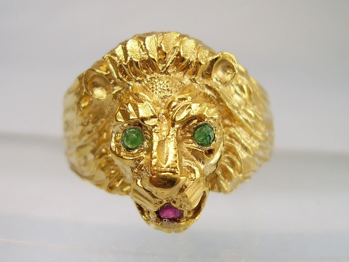1412003. HERRENRING LÖWENKOPF-RING SMARAGDE + RUBIN.