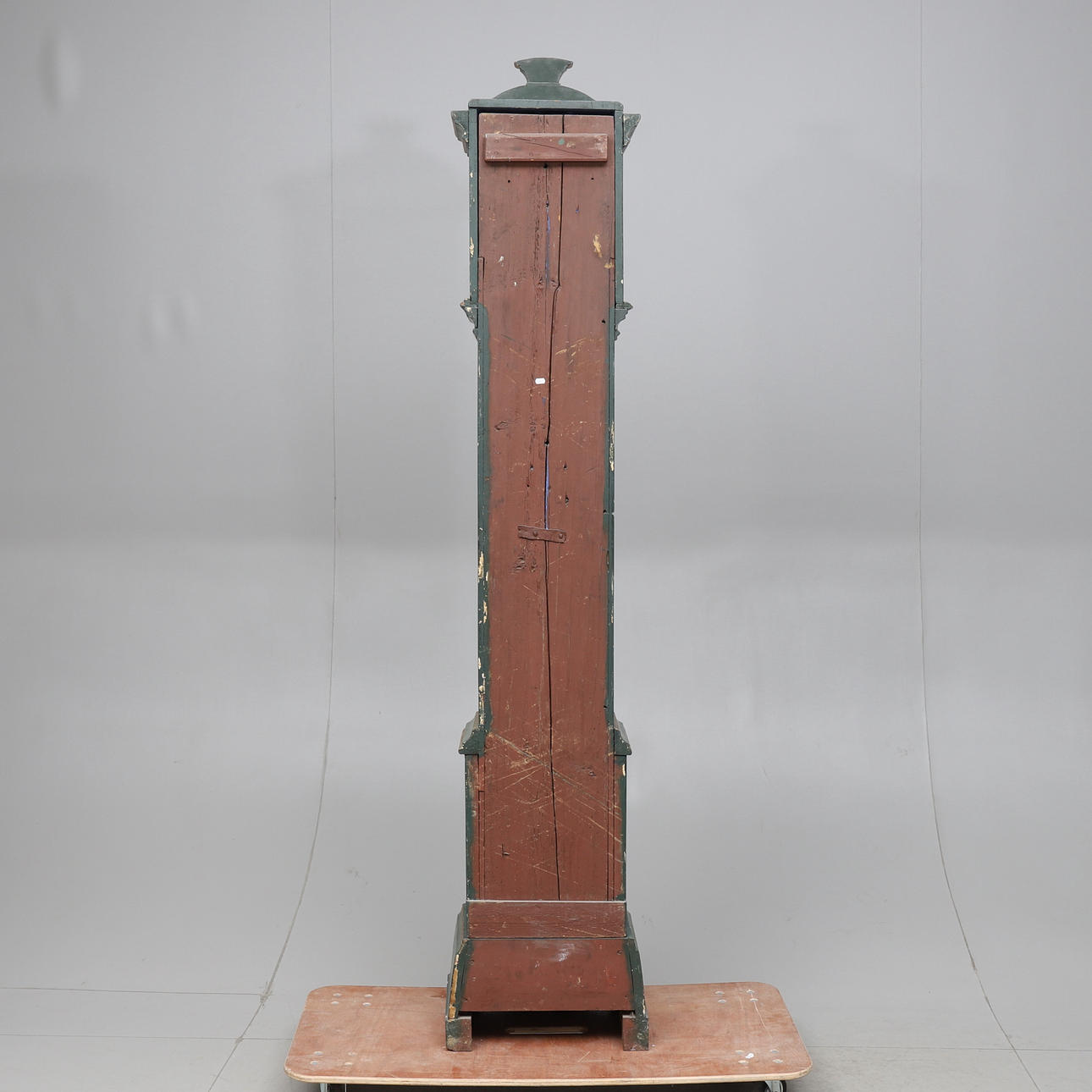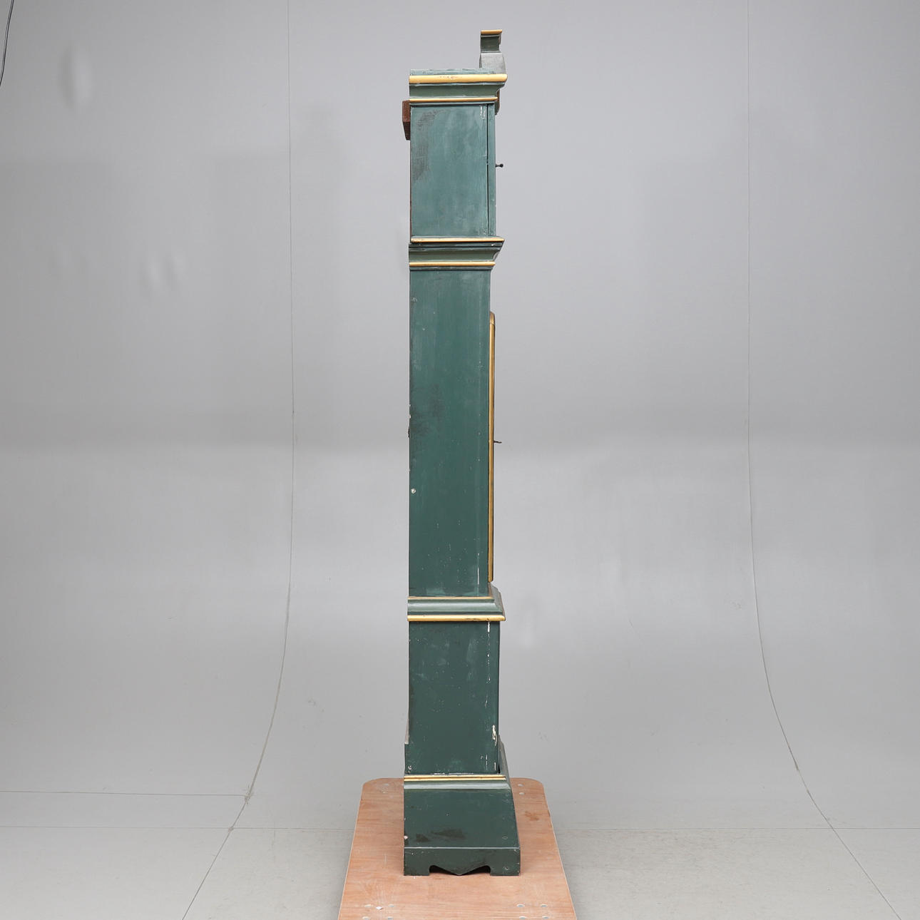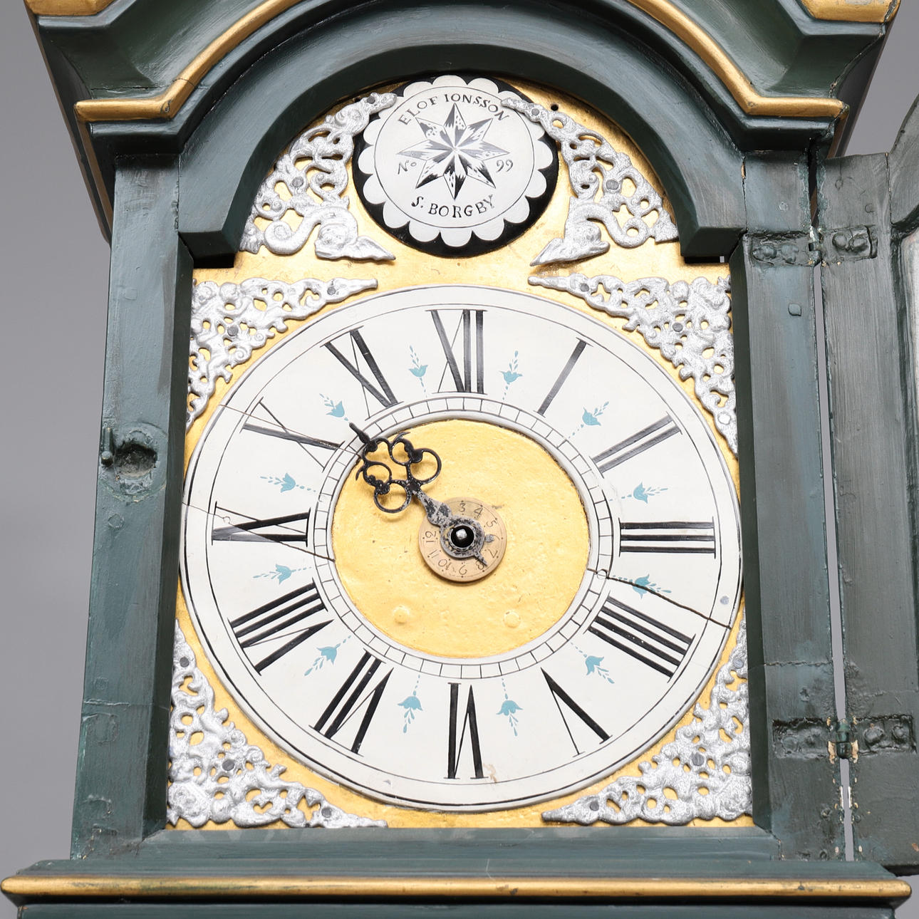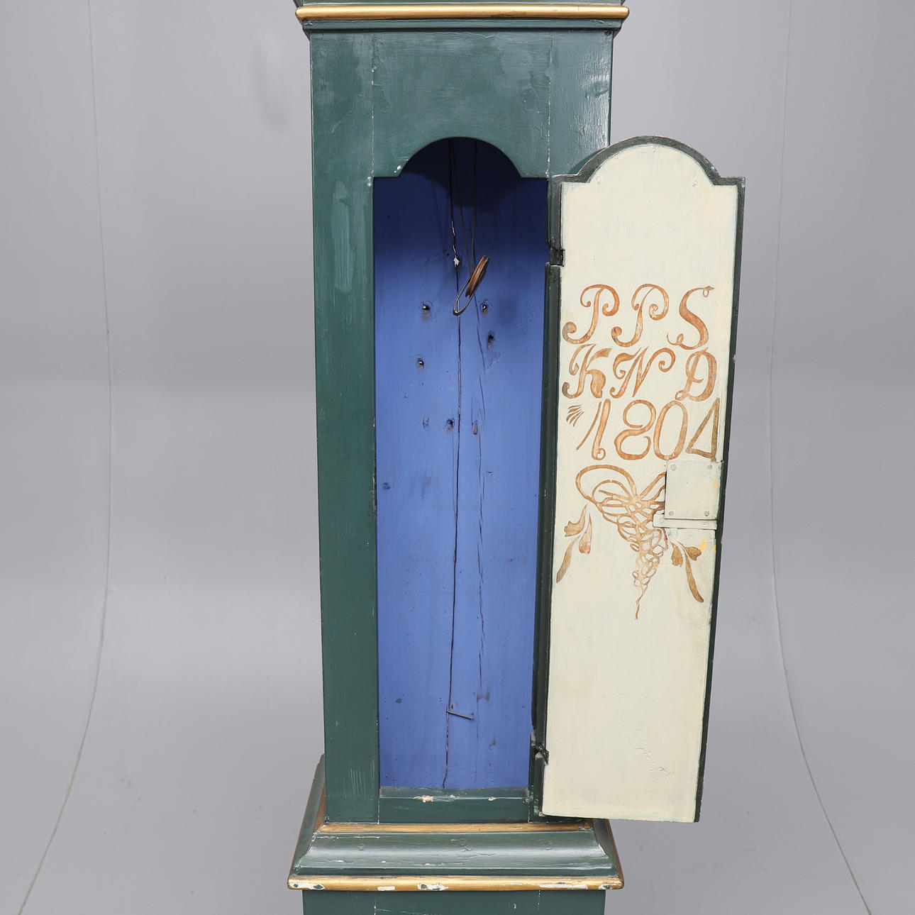 Gemalt. Teilbar. Zifferblatt markiert Elof Jonsson. Datiert 1804 in der Malerei. Ein Lot und ein Pendel sind vorhanden. Länge 49. Breite 33. Höhe ca. 236 cm.