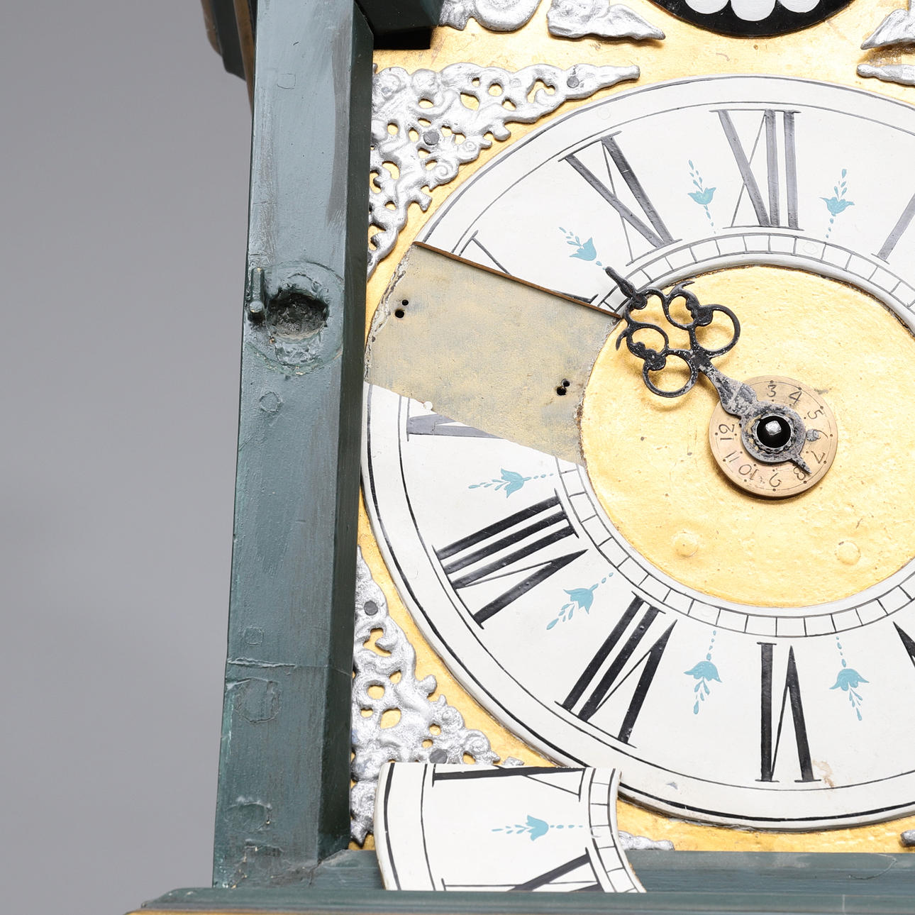 Nicht funktionsgeprüft. Tragen. Trockene Risse. Farbverlust. Spätere Malerei. Zifferblatt mit losen Teilen.