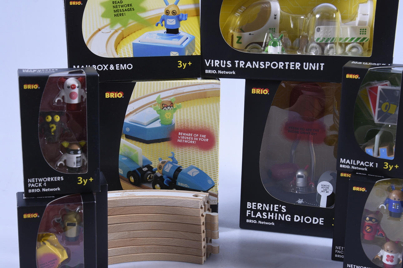 Brio-Eisenbahn, Großserie Ein Menge Networker, Starter-Set und mehrere Briefkästen mit Soundeffekt-Löffeln, Blinkdiode etc.