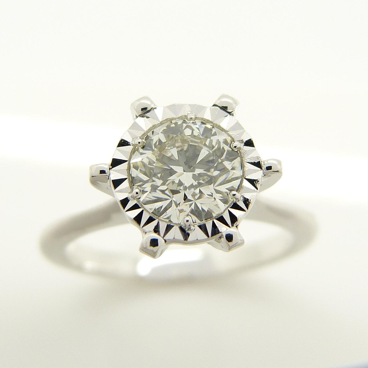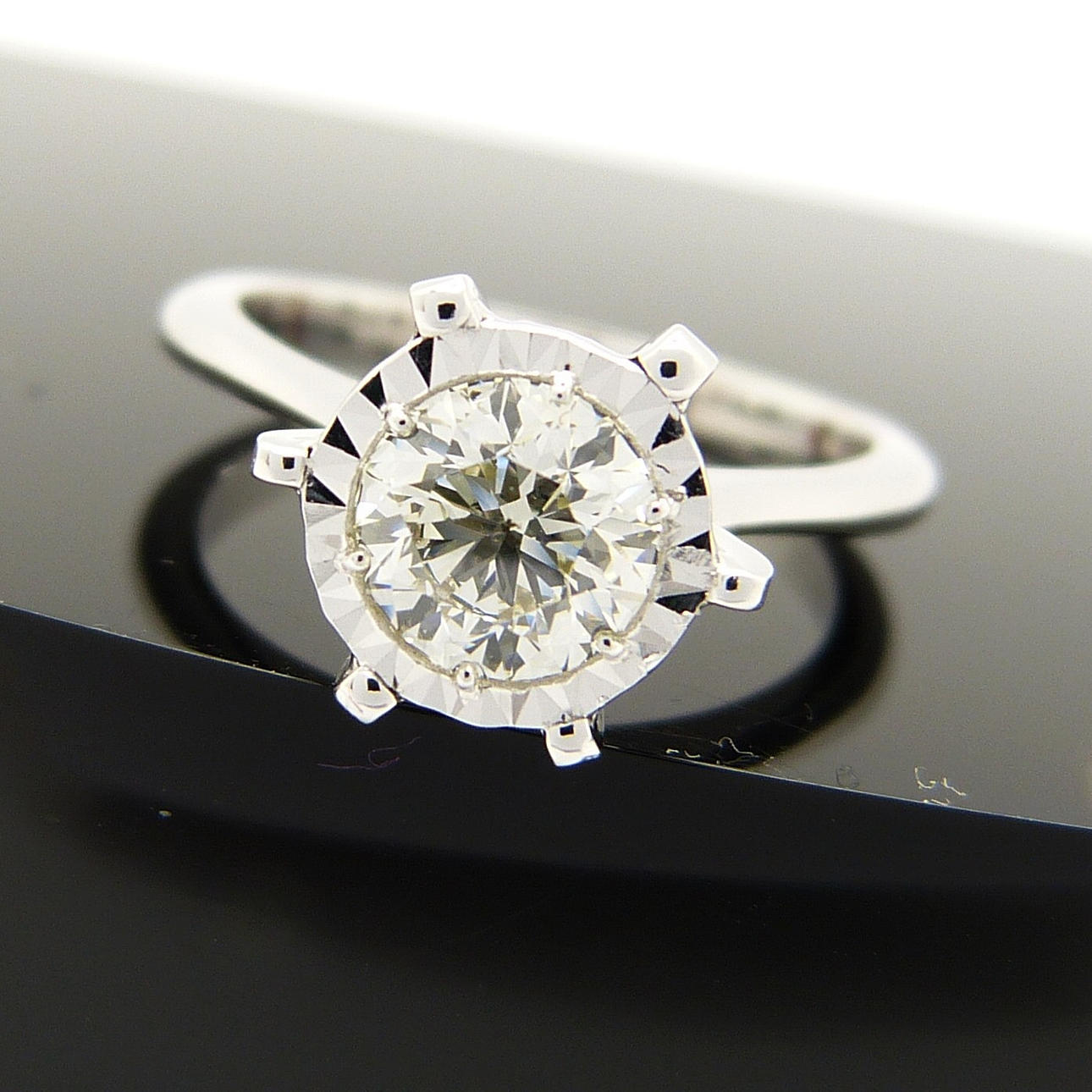 Die DIAMANT sind (wie im Zertifikat aufgeführt): • Karatgewicht: 0,80 ct • Farbe: K • Reinheit: SI2 • Schliff: Rund, Brillantschliff • Schliffgrad: Gut EU-Ringgröße: 51½. UK-Ringgröße: L Gewicht des Rings: 3,7 Gramm.