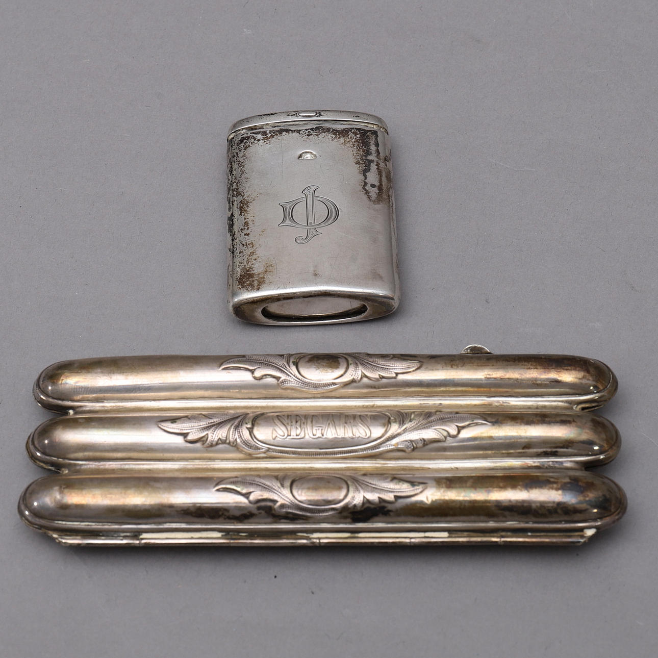 Streichholzschachtel, Silber, Import gestempelt, ca. 6,2x4,5 cm, Gewicht ca. 62,3 Gramm. Zigarrenetui für drei Zigarren, Neusilber, ca. 14x5,5 cm.