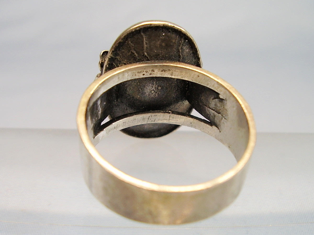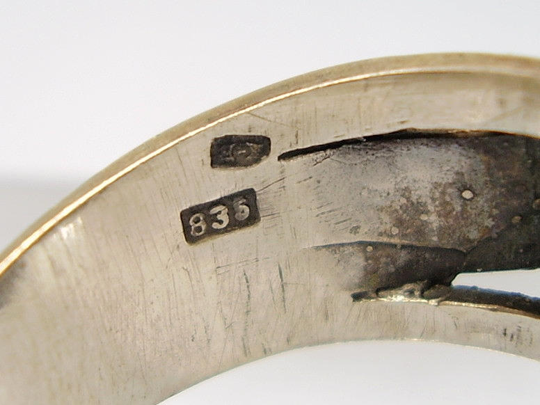 Der Ring ist in Silber 835 gearbeitet und punziert, dazu trägt er das Goldschmiede-Meisterzeichen "K.B.".