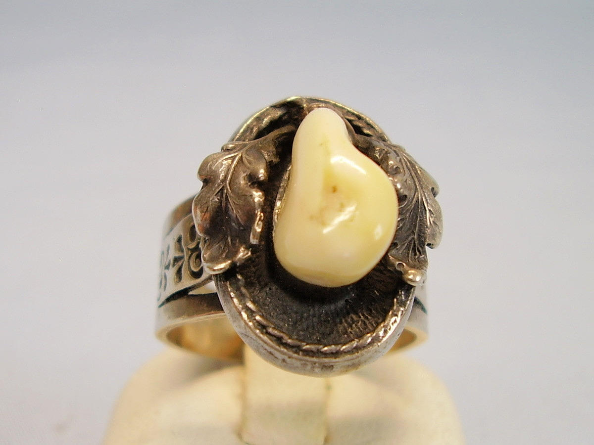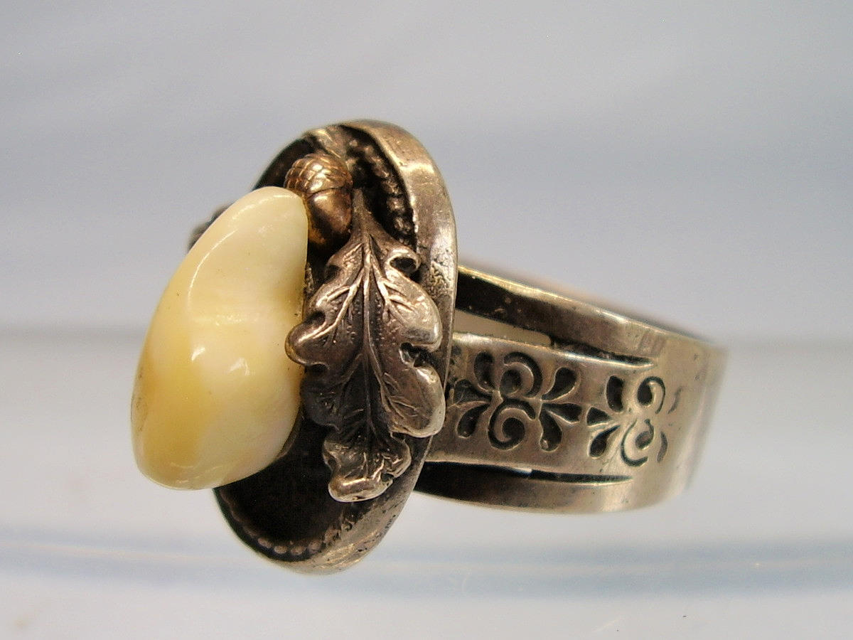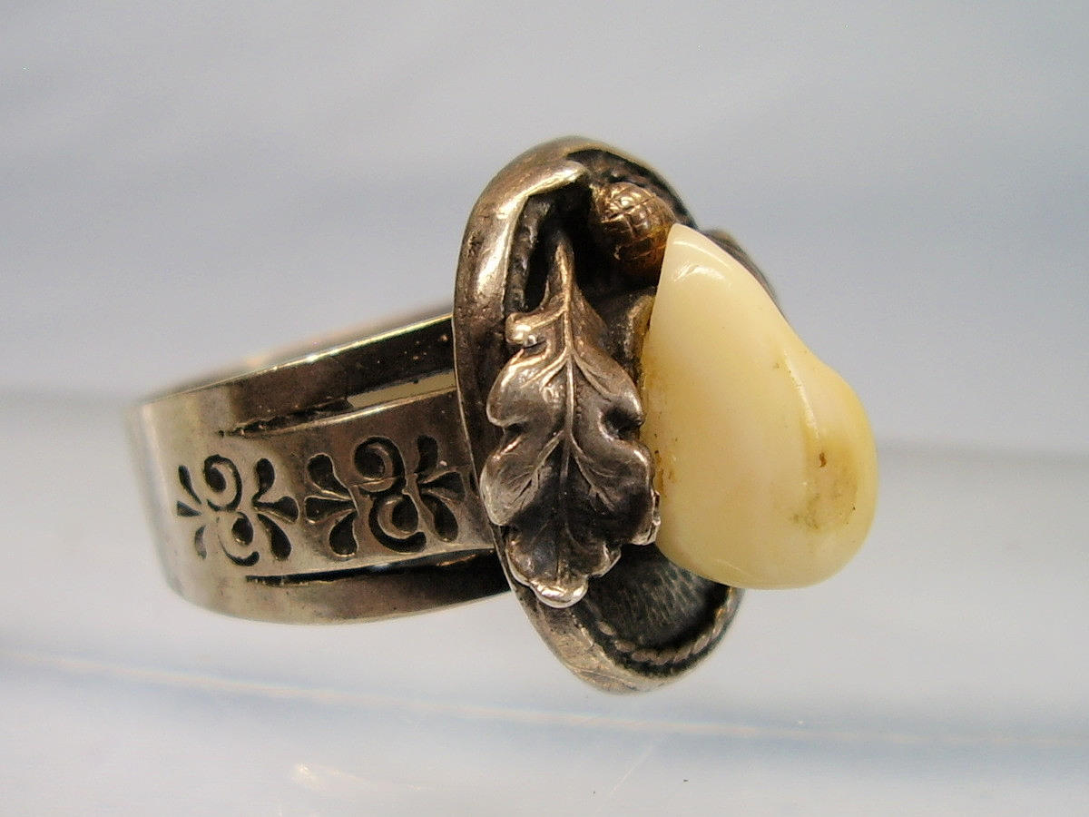 Der ovale Ringkopf ist besetzt mit einer Hirschgrandel in natürlicher Patina, die von reliefierten Eichblättern umgeben ist und in einem vergoldeten Eichelbecher steckt. Der Fond ist nielliert und bildet einen schönen Kontrast zur Grandel.