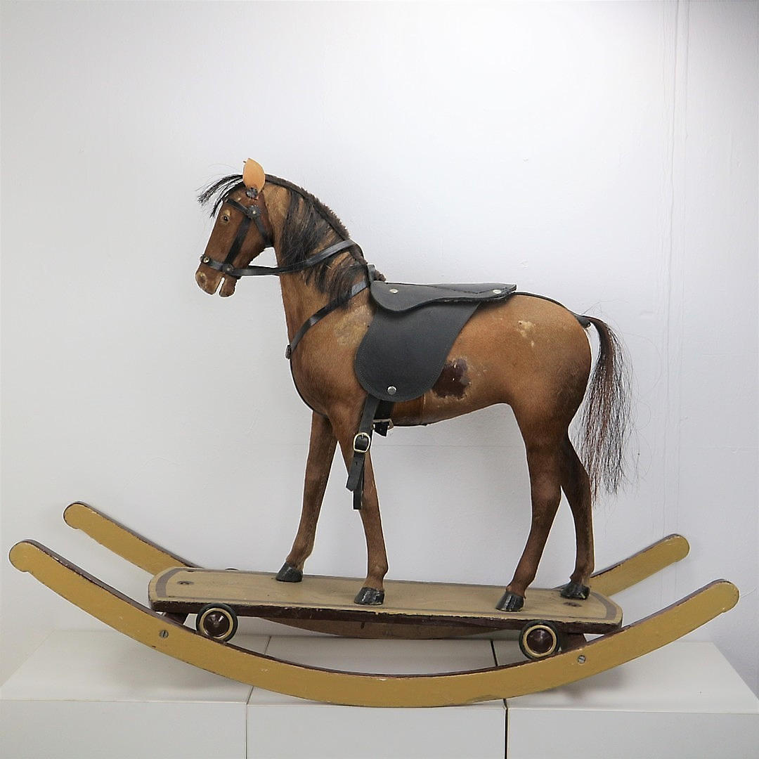 Ein antikes Holzschaukelpferd mit Echthaar, Anfang 20. Jahrhundert, Roßhaar, Fell, Glasaugen, Maße: 75 x 76 cm.