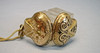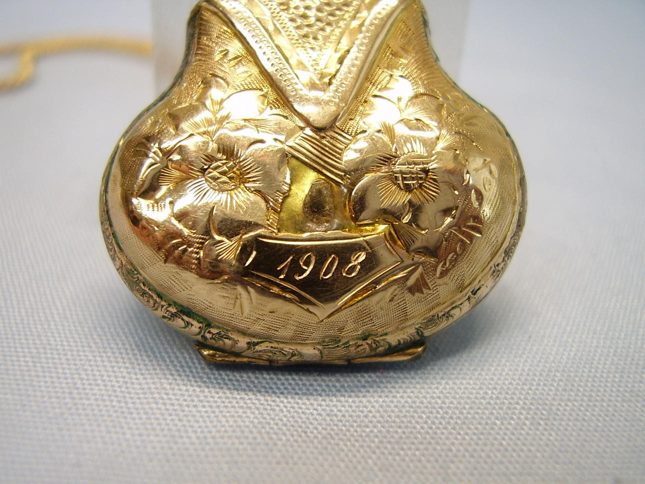 Vorder- und Rückseite sind ornamental reliefiert, die Vorderseite ist mit schwarzem Emaille verziert. Die Rückseite trägt das handgravierte Datum 1908.