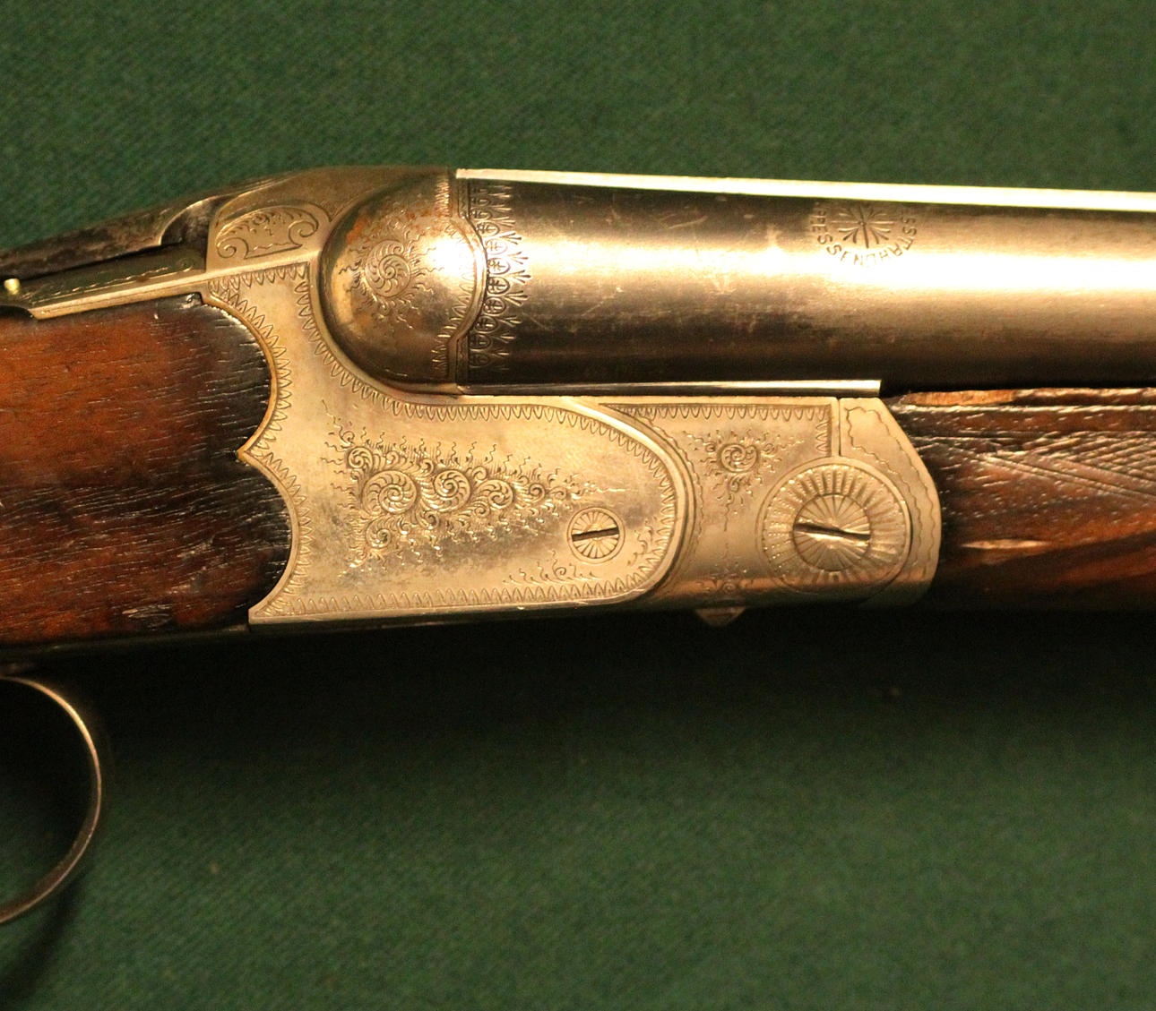 Tel. Nr. 15763. Lauflänge 69cm. Erweiterte Spannweite mit Querbolzen. Obere Leber. Kugelschalter am Kolbenhals. Seitliche Ohren. Doppelabzug mit sanftem Druck auf der Vorderseite. Grüner Seitenschutz. Klappbares Visier. reich gravierte Basküle. Kolben mit Pistolengriff und Wangenauflage. Hornback-Mütze.