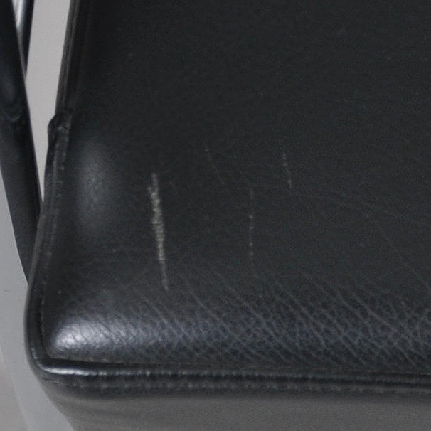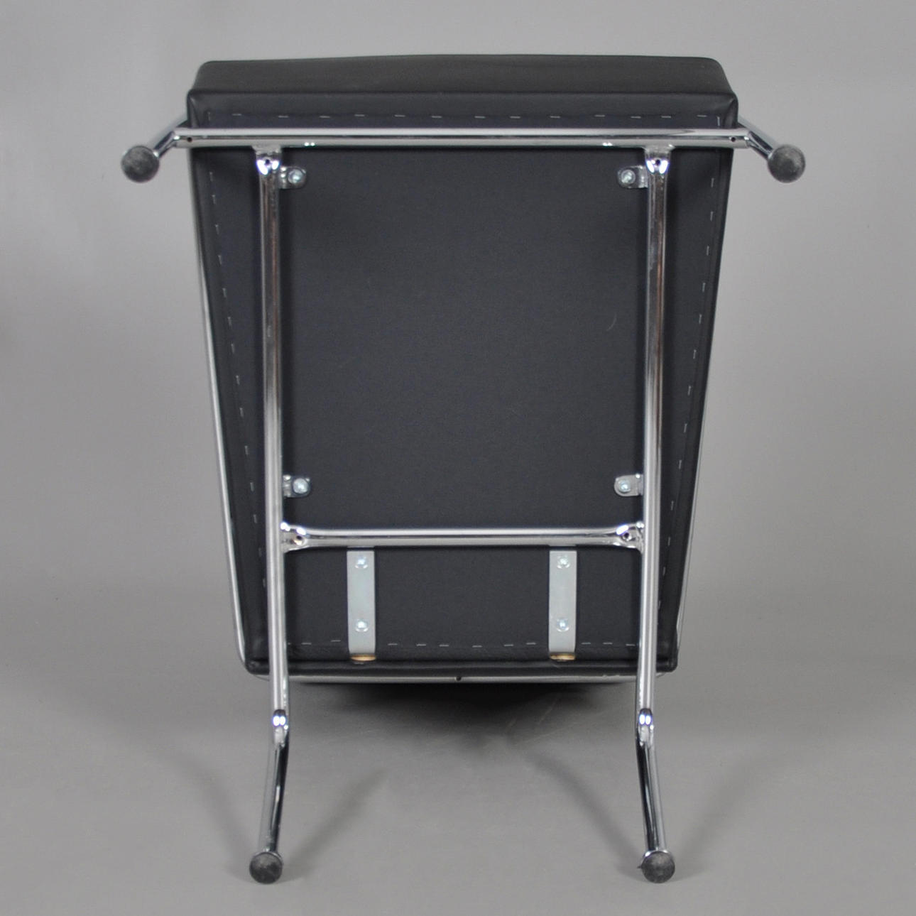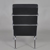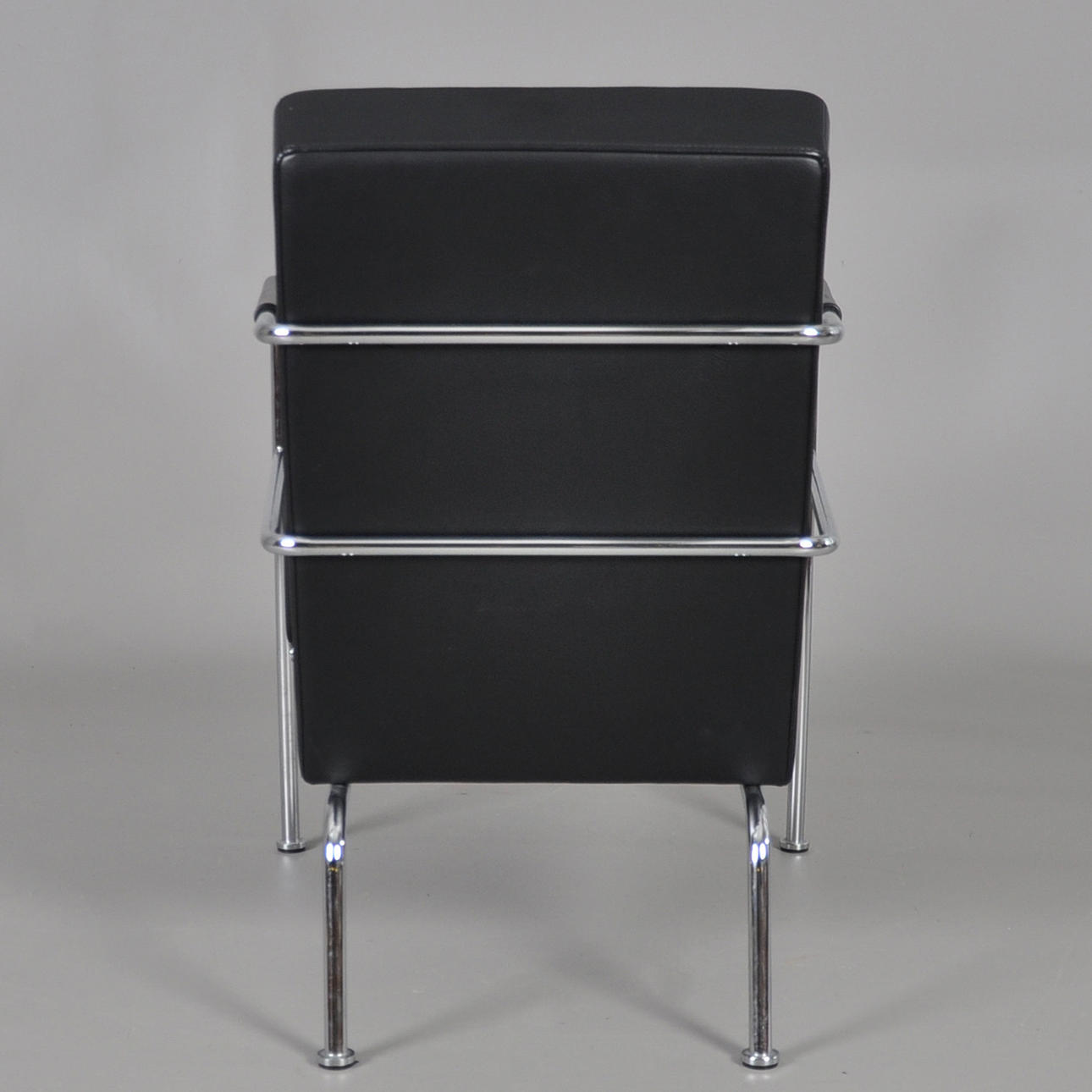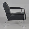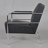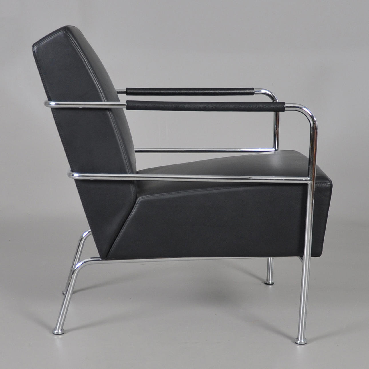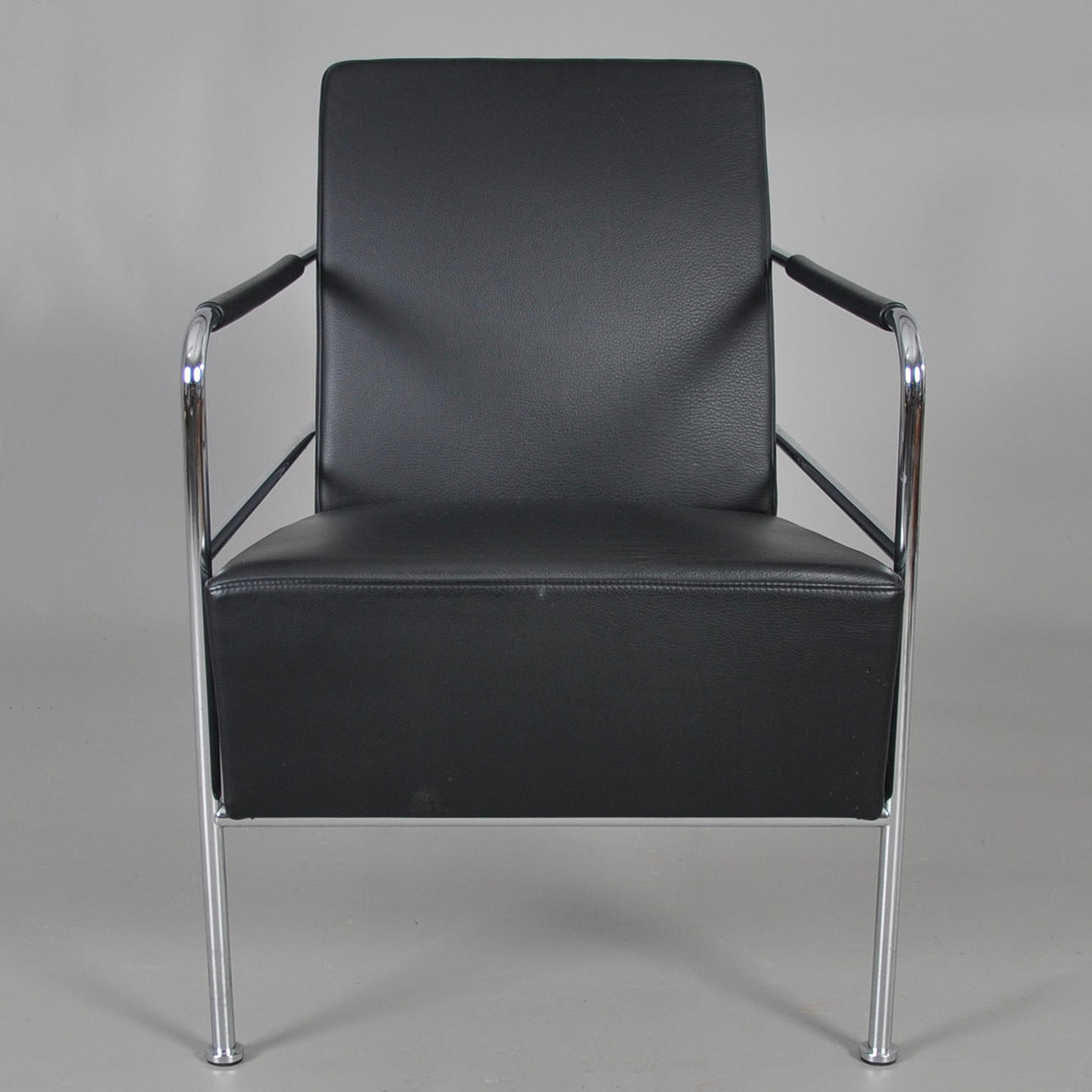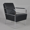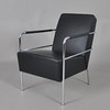 Sessel mit Gestell aus verchromtem Stahlrohr, fest gepolsterter Rücken und Sitz aus schwarzem Leder.