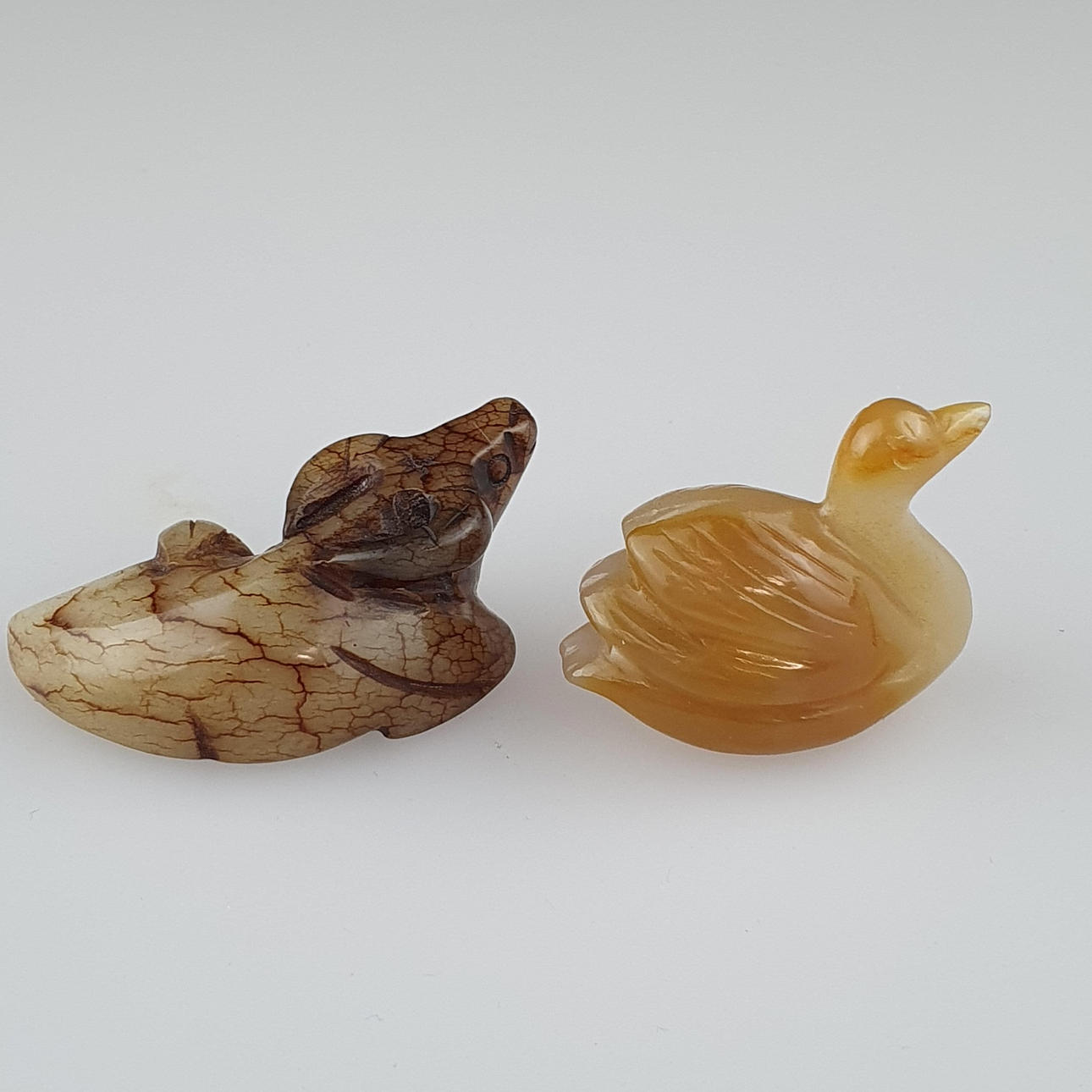 1x Liegender Ochse, hellgraue Jade mit braunen Einschlüssen, HxL.ca.2,2x5cm, 1x Ente, weiß-gelber Achat, HxL:ca.3x3,8cm.
